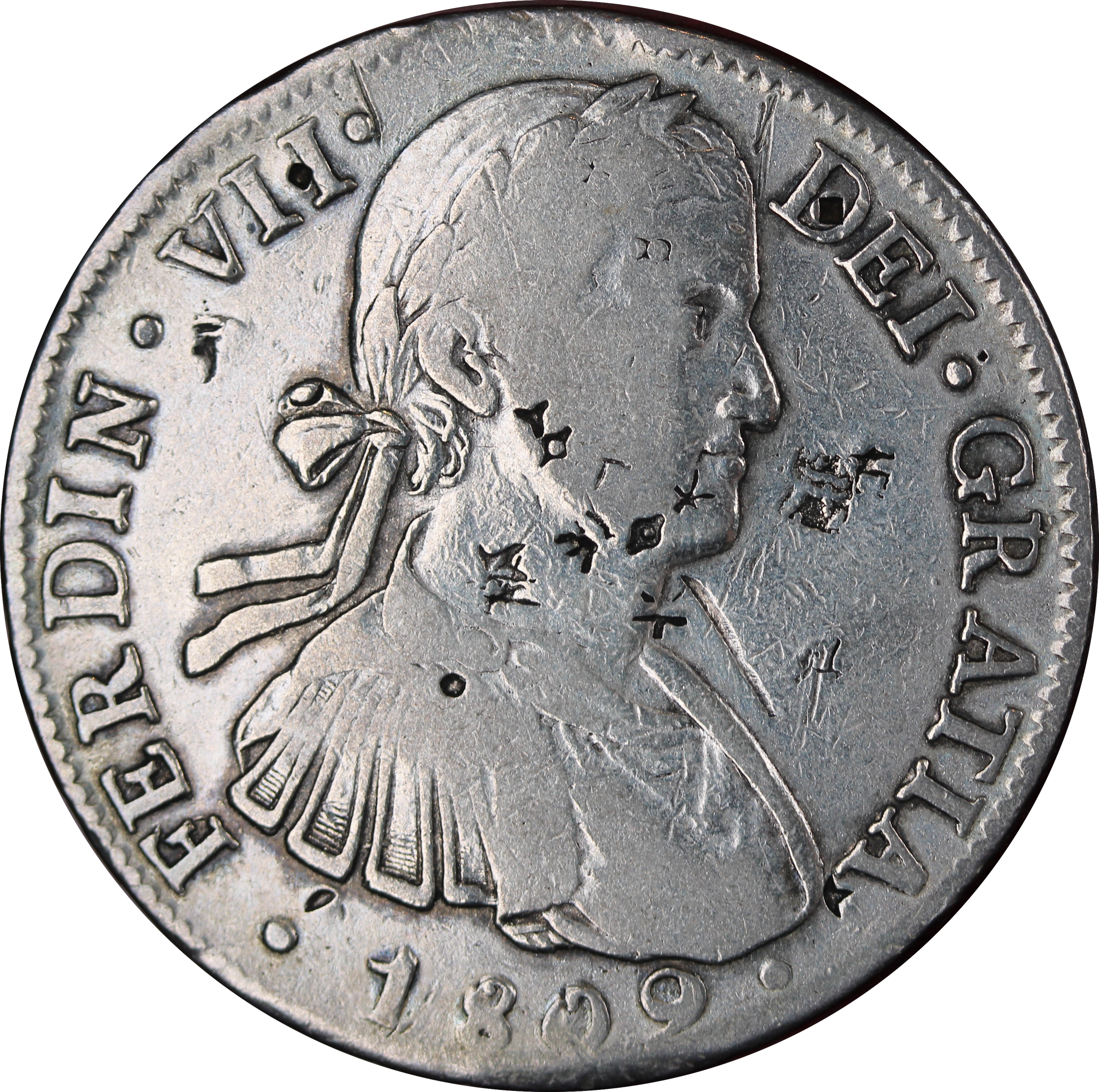 Struck in 1809 at the Mexico City Mint, this 8 Reales features the bust of King Ferdinand VII and represents one of the most important trade coins of the Spanish Empire. In about Fine condition, the coin shows honest circulation wear consistent with heavy use. Multiple chopmarks attest to its acceptance in Asian trade markets, where the silver content was tested and validated, adding historical character and evidence of its global commercial journey.
