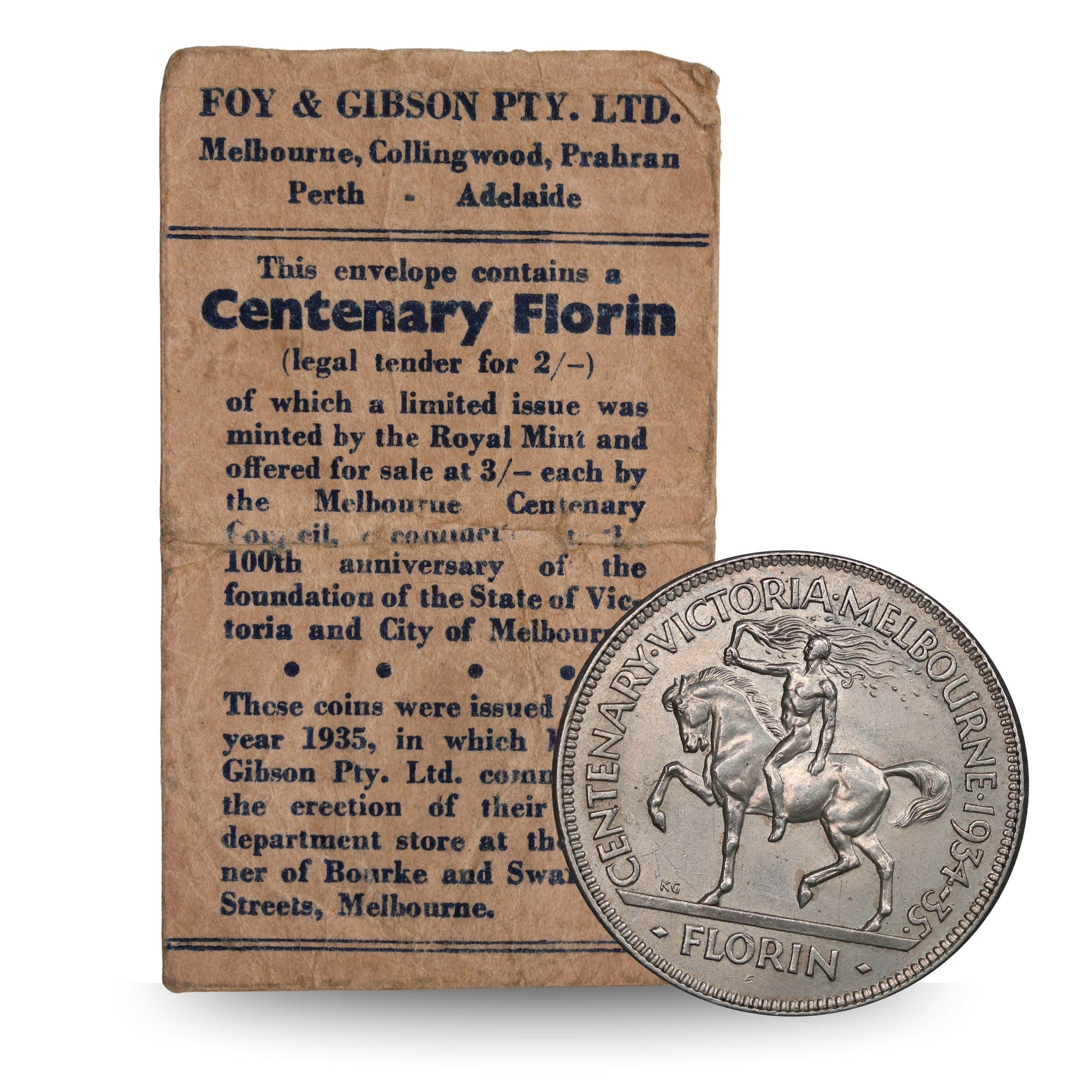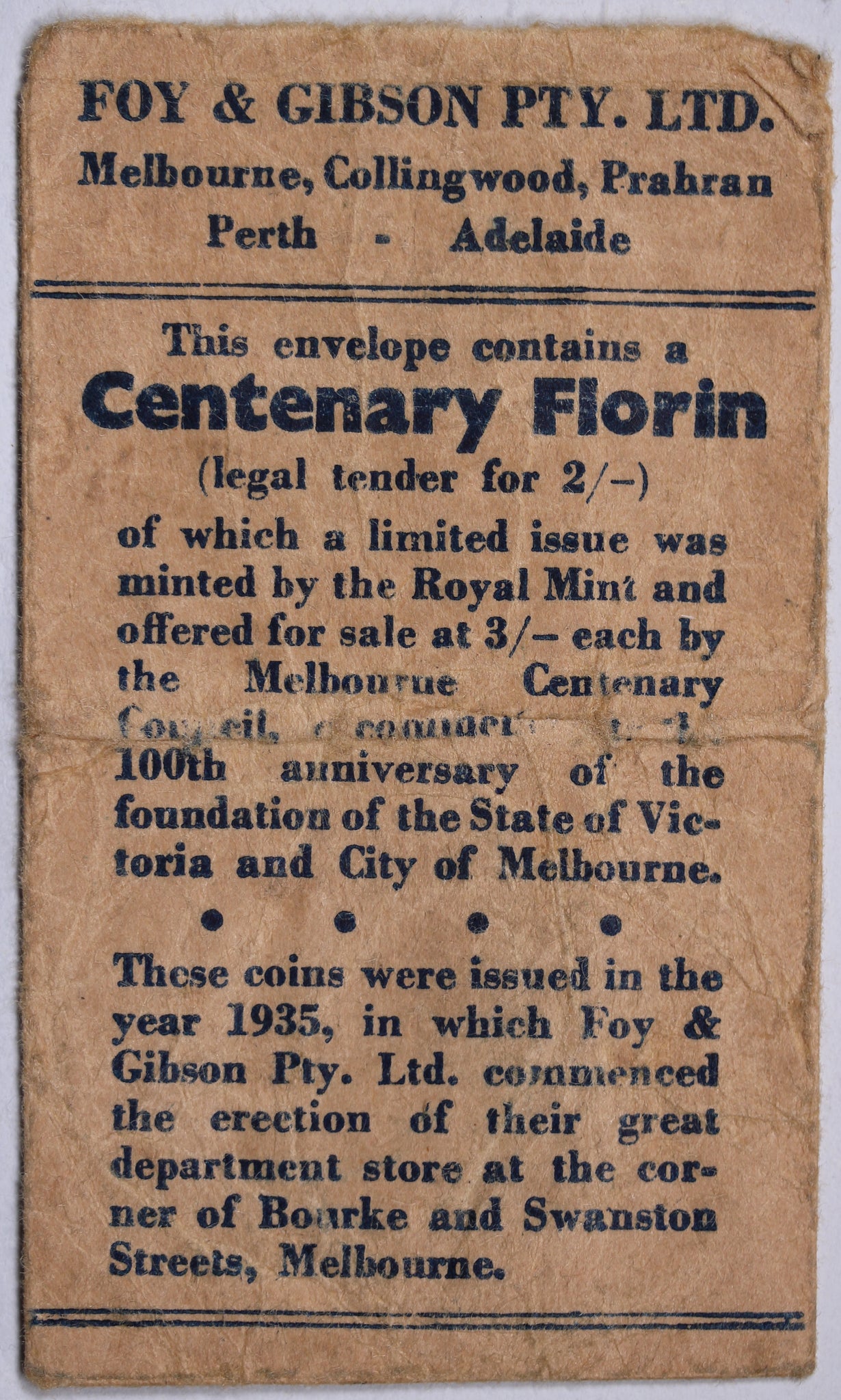 The Foys envelopes were distributed at both the Melbourne and Perth Foy and Gibson outlets to customers in the wake of the lacklustre engagement of the community when the commemorative florins were originally offered at a 1 shilling premium.