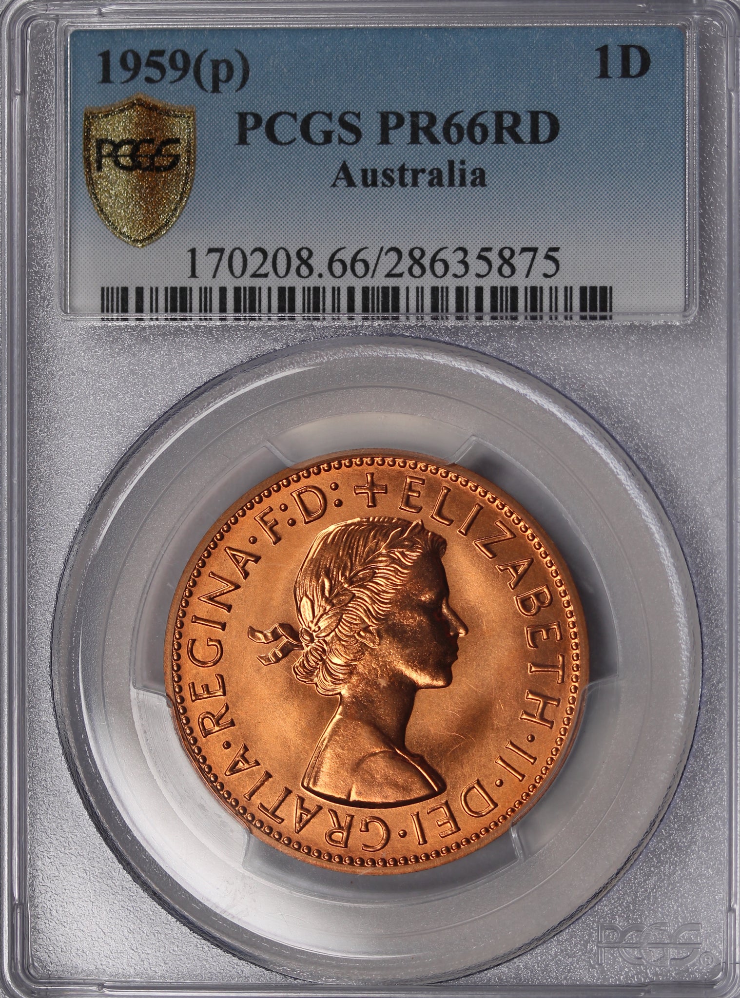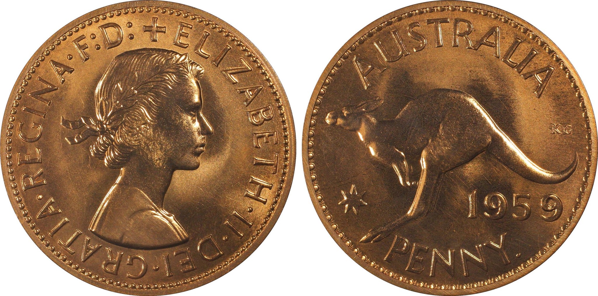 The 1959(P) Australian Penny Proof was struck at the Perth Mint in limited numbers, showcasing a superb polished finish intended for collectors. The obverse features Queen Elizabeth II’s first portrait by Mary Gillick, while the reverse displays the iconic kangaroo design by George Kruger Gray. Proof coins from this era are prized for their sharp detail, mirror-like fields, and low mintages, making them highly desirable additions to serious Australian pre-decimal coin collections.