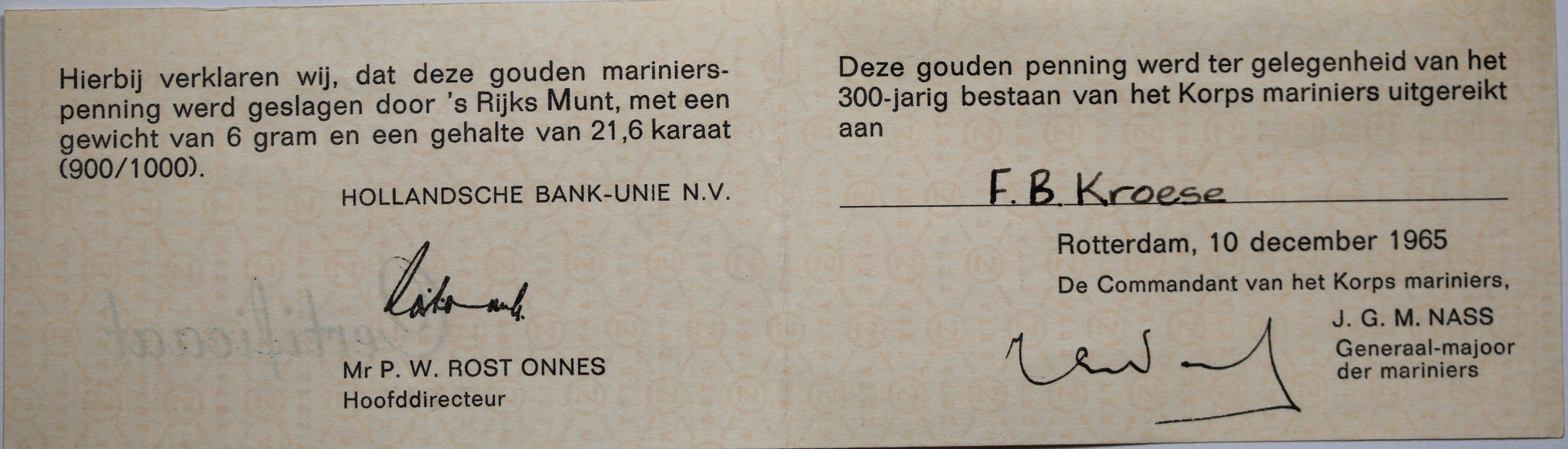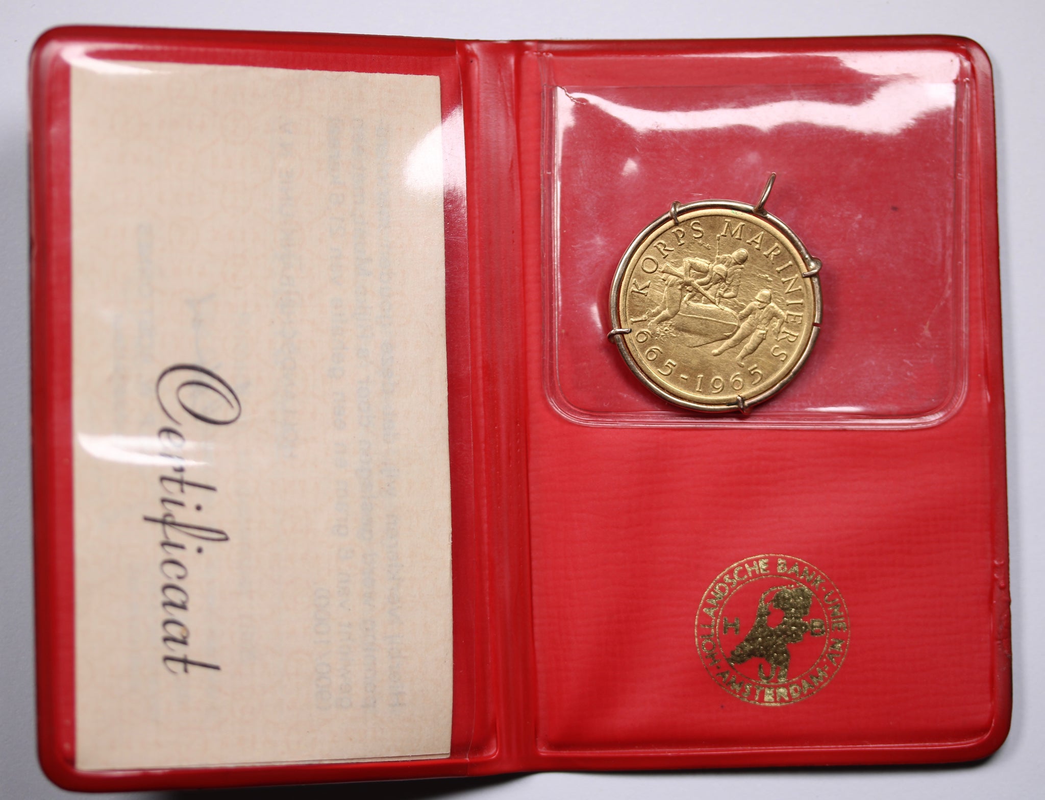 This 1965 gold medal commemorates the 300th anniversary of the Dutch Marine Corps, celebrating one of the world’s oldest and most respected naval infantry forces. Struck in 90% gold and weighing 6 grams, it combines historical significance with intrinsic value.