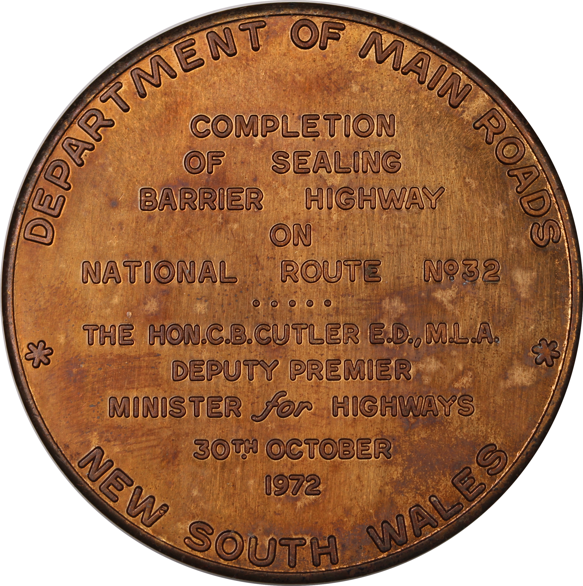 1972 Department of Main Roads NSW Completion Barrier Highway Bronze Medallion