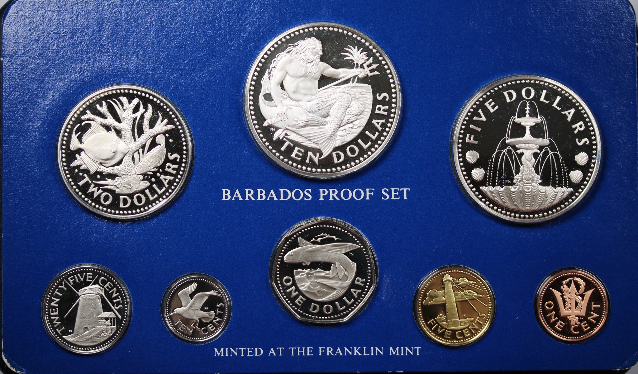 The 1975 Barbados Proof Set, struck by the Franklin Mint, features coins from one cent to ten dollars bearing the national coat of arms and Queen Elizabeth II. With deeply mirrored fields and frosted designs, the set highlights Barbados’ rich heritage and pride as a young independent nation within the Commonwealth.