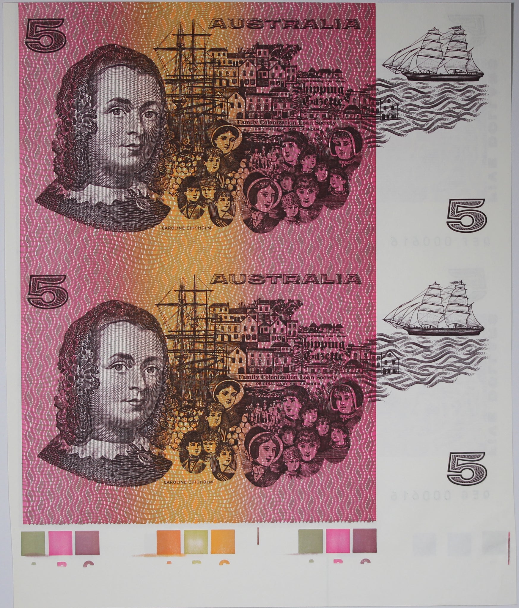 1990 Australia Five Dollars Uncut Vertical Pair Fraser/Higgins (Bottom Selvedge)