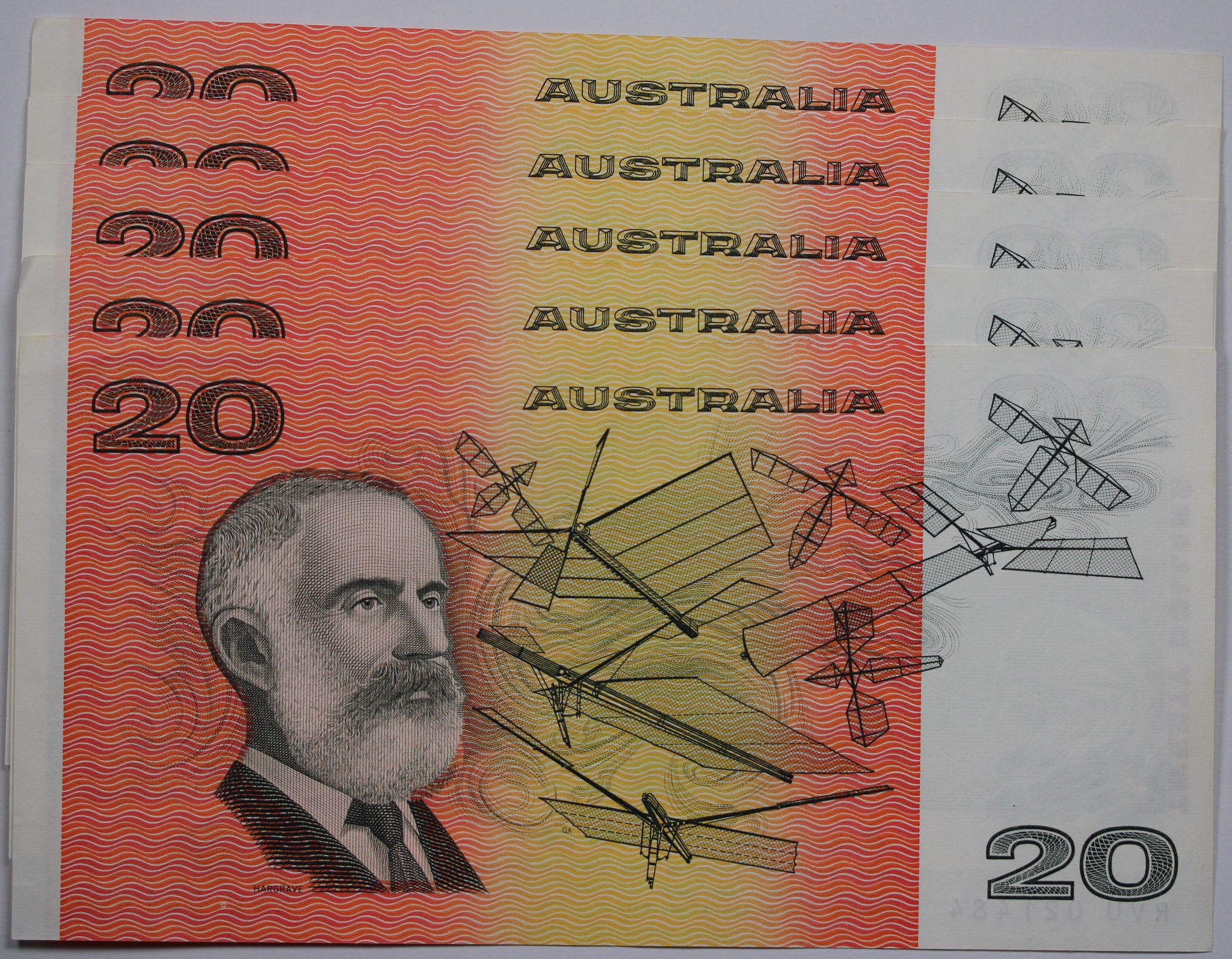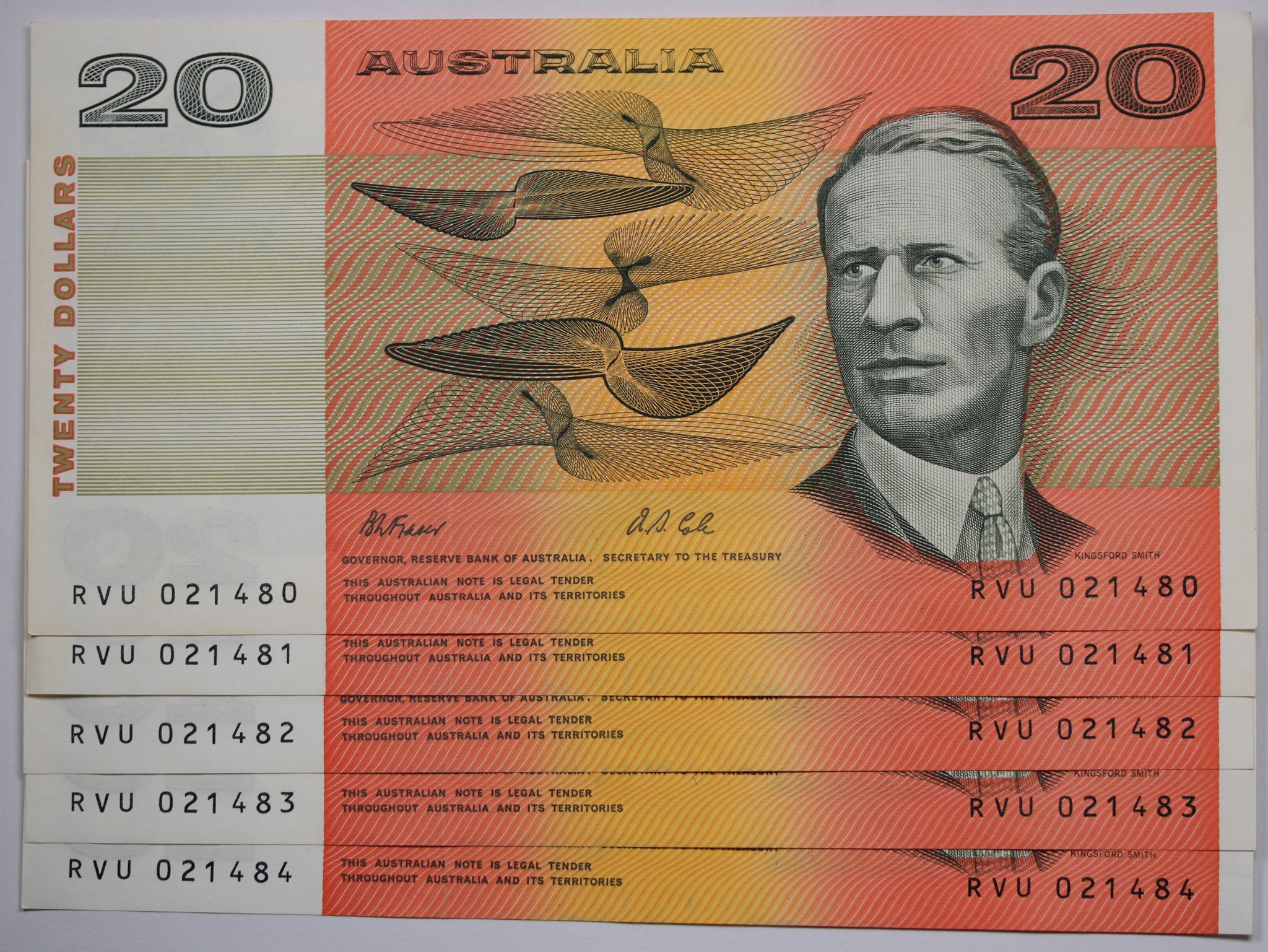 1991 $20 Fraser/Cole Banknotes Consecutive run of 5 aUNC