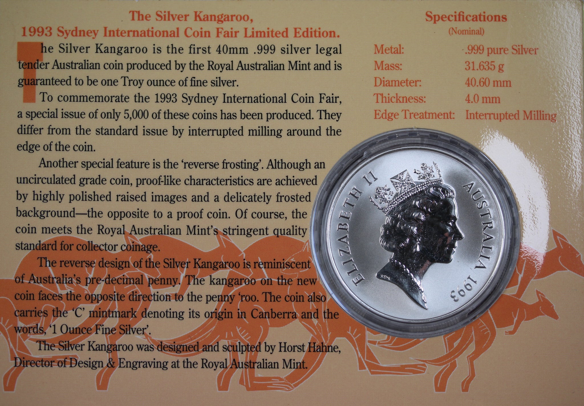 This was the first year of the iconic Kangaroo series from the Royal Australian Mint. This was issued for Sydney Coin show in 1993.
