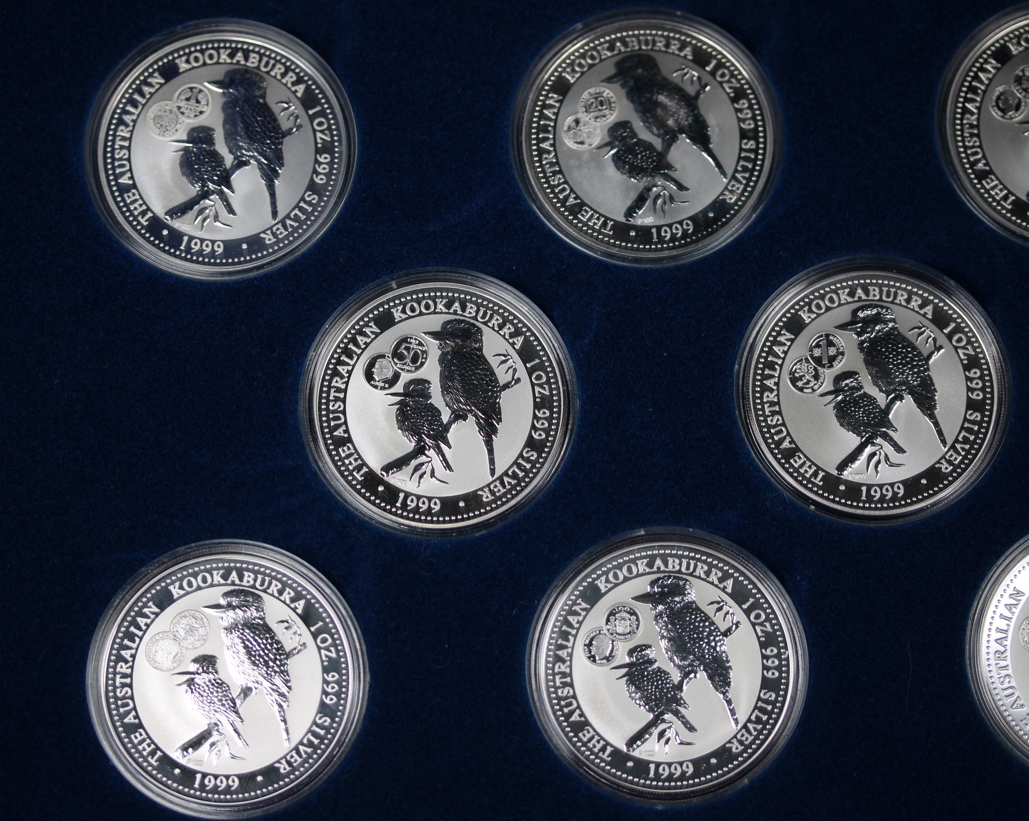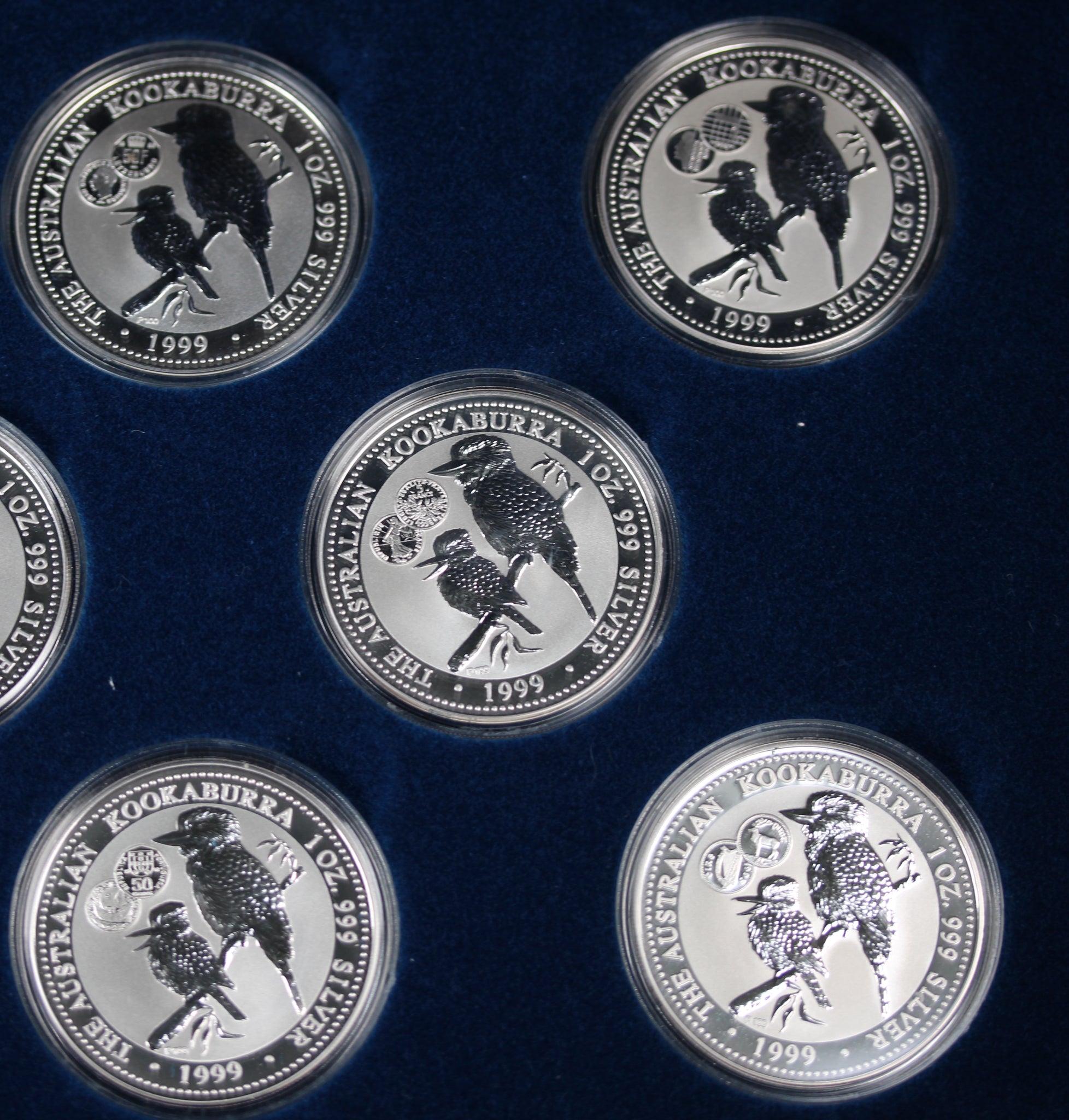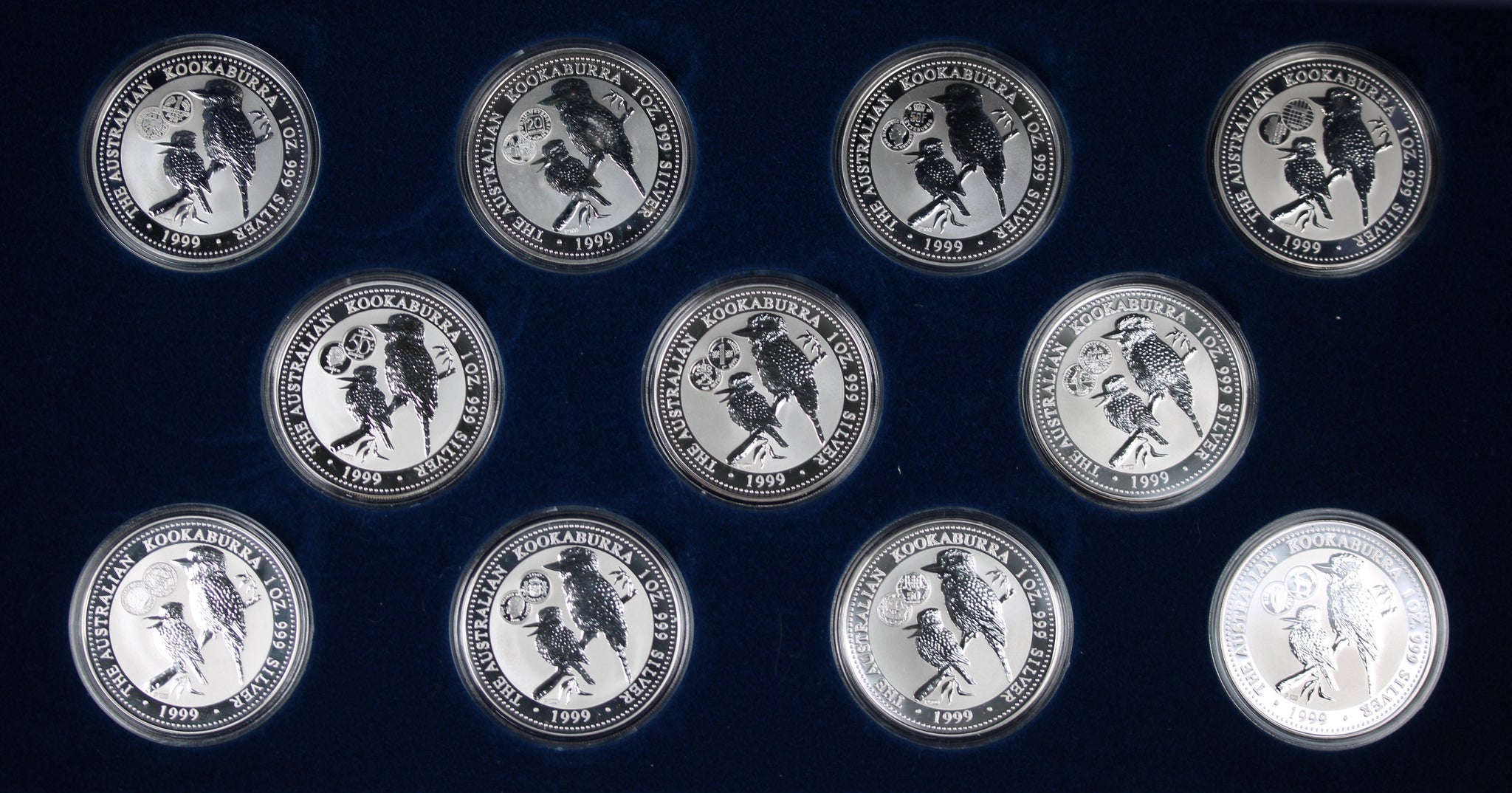 Across 1999, the Perth Mint struck a series of 11 silver 1oz kookaburra coins to commemorate the formation of the European Monetary Union.