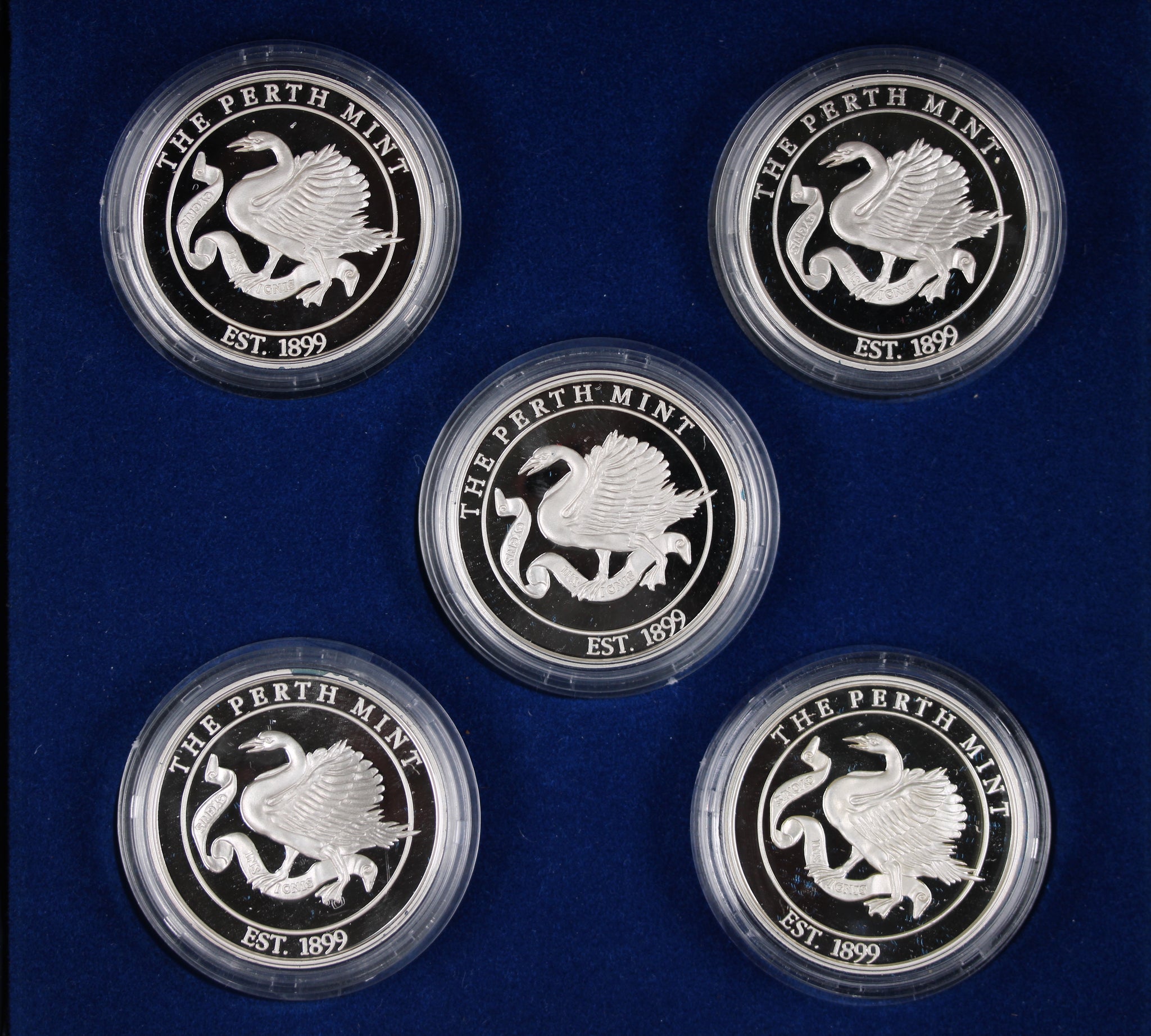 Issued by the Perth Mint in 1999, this exquisite 1oz Silver Medallion Set celebrates Australia’s most colourful and iconic birdlife. The collection features five proof-quality medallions struck in .999 fine silver, each depicting a beautifully detailed and vividly coloured bird — the Red Collared Lorikeet, Sulphur-Crested Cockatoo, Golden Bowerbird, Splendid Blue Wren, and Red-Backed Kingfisher. Every design captures the natural grace and personality of these native species, enhanced with rich colour application and fine engraving.