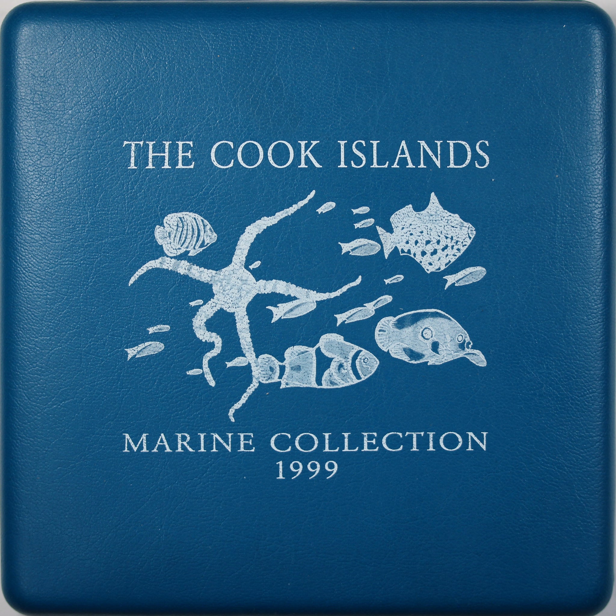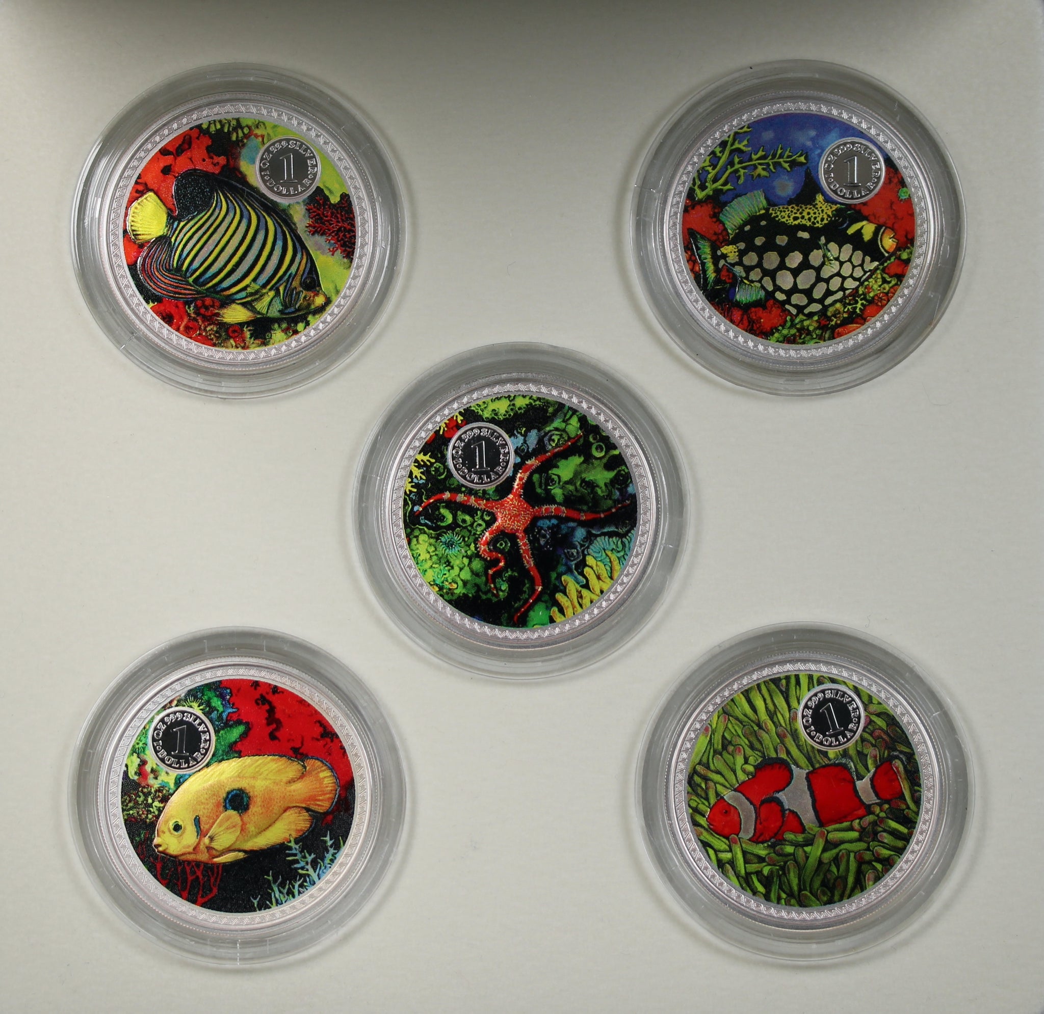 Issued by the Cook Islands in 1999, this proof-quality five-coin silver set features marine-animal motifs (Regal Angelfish, Lemonpeel Angelfish, Clown Anemone Fish, Southern Serpent Starfish & Clown Triggerfish). It is struck in .999 fine silver and housed in a presentation case with certificate.