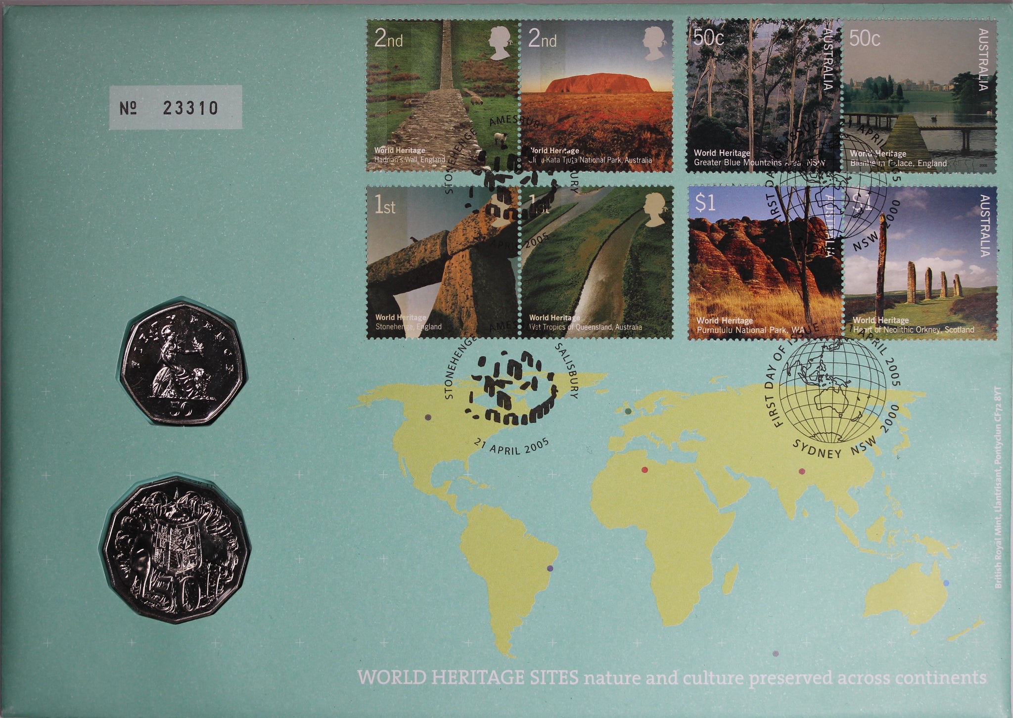 The 2005 50 Cent Two-Coin PNC marks a special joint issue between Australia and the United Kingdom, celebrating their shared World Heritage sites. Each PNC contains Australia’s 50-cent coin and the UK’s 50-pence coin, both featuring designs honouring the natural and cultural treasures recognised by UNESCO. Housed in an attractive Australia Post cover, this limited-edition release highlights the historic and environmental connections between the two nations, making it a meaningful collectible for coin and philatelic enthusiasts alike.