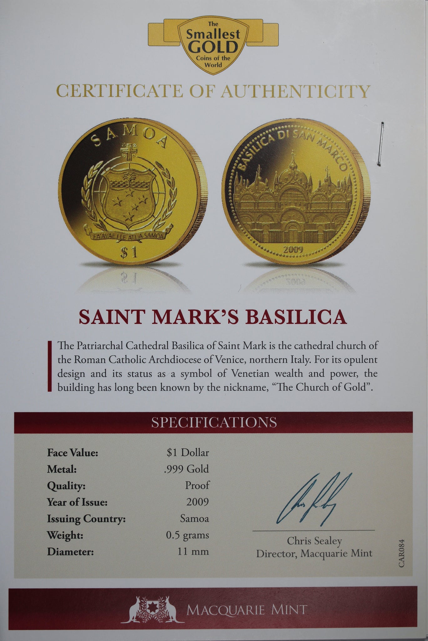 2009 $1 Samoa Saint Marks Basilica 0.5g Gold Coin