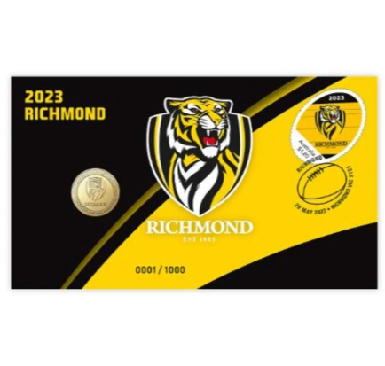 The 2023 $1 Richmond AFL Postal Numismatic Cover (PNC) commemorates the Richmond Football Club's rich history and achievements in the Australian Football League. Issued by Australia Post in collaboration with the Royal Australian Mint, this limited-edition collectible features an uncirculated $1 coin embossed with the club's iconic logo. Each cover is individually numbered, enhancing its appeal to collectors and fans alike. With a mintage of only 1,000 units, this PNC is a must-have for those looking to celebrate the Tigers' legacy.