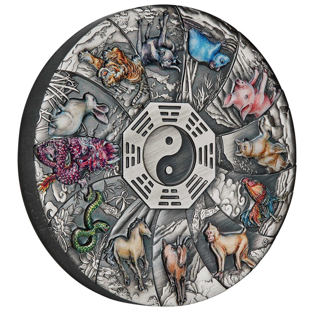 The coin depicts 12 lunar animals in colour, each within a sail-shaped panel featuring representations of their natural or, in the dragon’s case, heavenly habitat. The imagery surrounds a bagua, a motif incorporating eight Taoist trigrams representing the yin and yang said to be present in all things. It also includes a taijitu, a black and white symbol that denotes the interdependence of yin and yang energy.