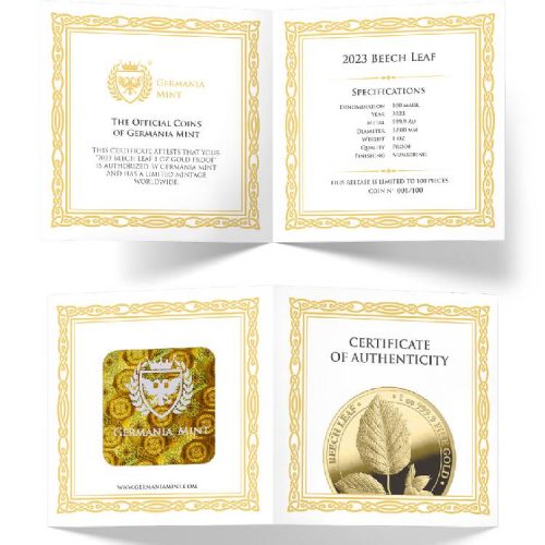Each piece of the 2023 Beech Leaf 1 oz Gold Proof is secured in a lens capsule, that allows you to admire the coin’s design even more. The included Certificate of Authenticity contains all the necessary information and guarantees the coin’s originality.