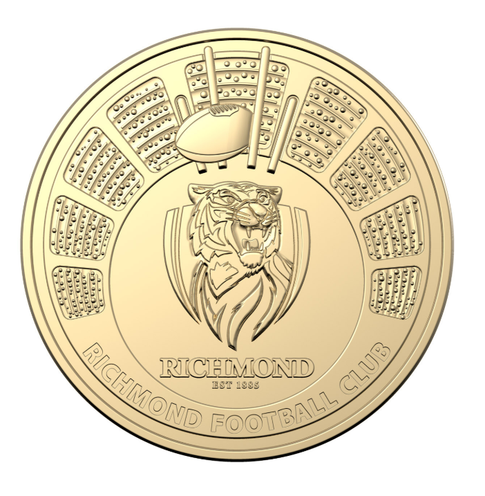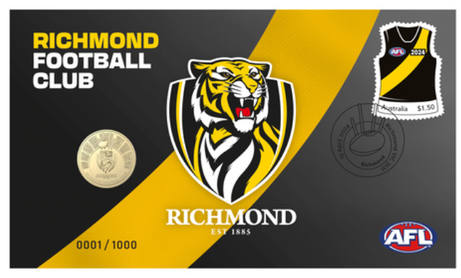 This limited-edition collectible celebrates the Richmond Football Club. Each cover features an uncirculated 2024 $1 coin minted by the Royal Australian Mint, showcasing the club's iconic logo. The cover also includes a specially designed guernsey-shaped stamp, adding a unique touch to this commemorative item. With a numbered edition, this PNC is a must-have for collectors and fans alike.