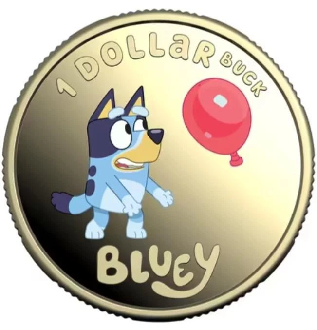 The 2024 $1 Bluey Silver Coloured Proof Coin celebrates Australia's beloved animated series, Bluey. Struck by the Royal Australian Mint, this limited-edition coin features a vibrant depiction of Bluey on the reverse and the effigy of King Charles III by Daniel Thorne on the obverse. Crafted in silver with a proof finish, it has a mintage of just 2,650, making it a sought-after collector's item for fans and numismatists alike.
