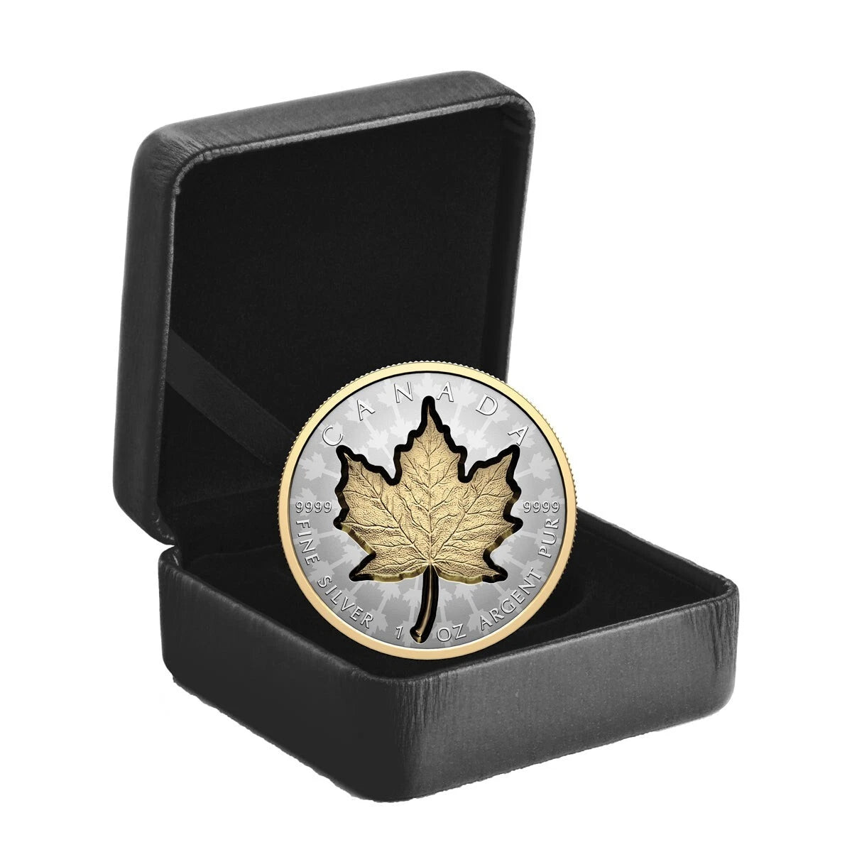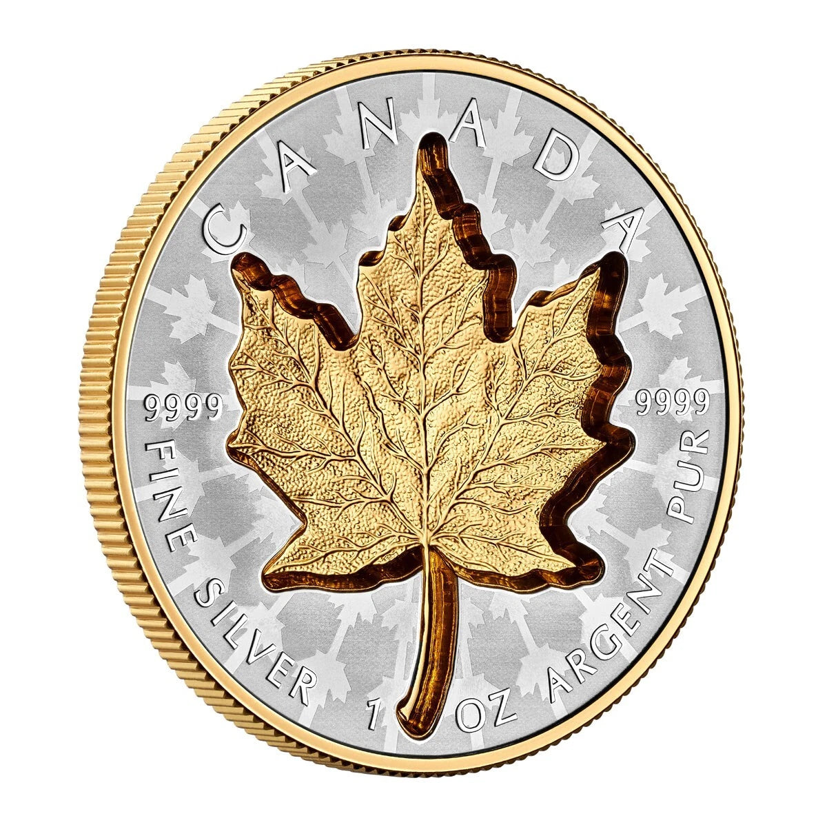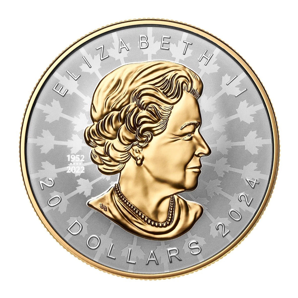 To emphasize the incuse strike and create an eye-catching contrast, the deeply recessed maple leaf has been plated with yellow gold. Gold plating also highlights both the coin’s edge and rim, and the effigy on the obverse