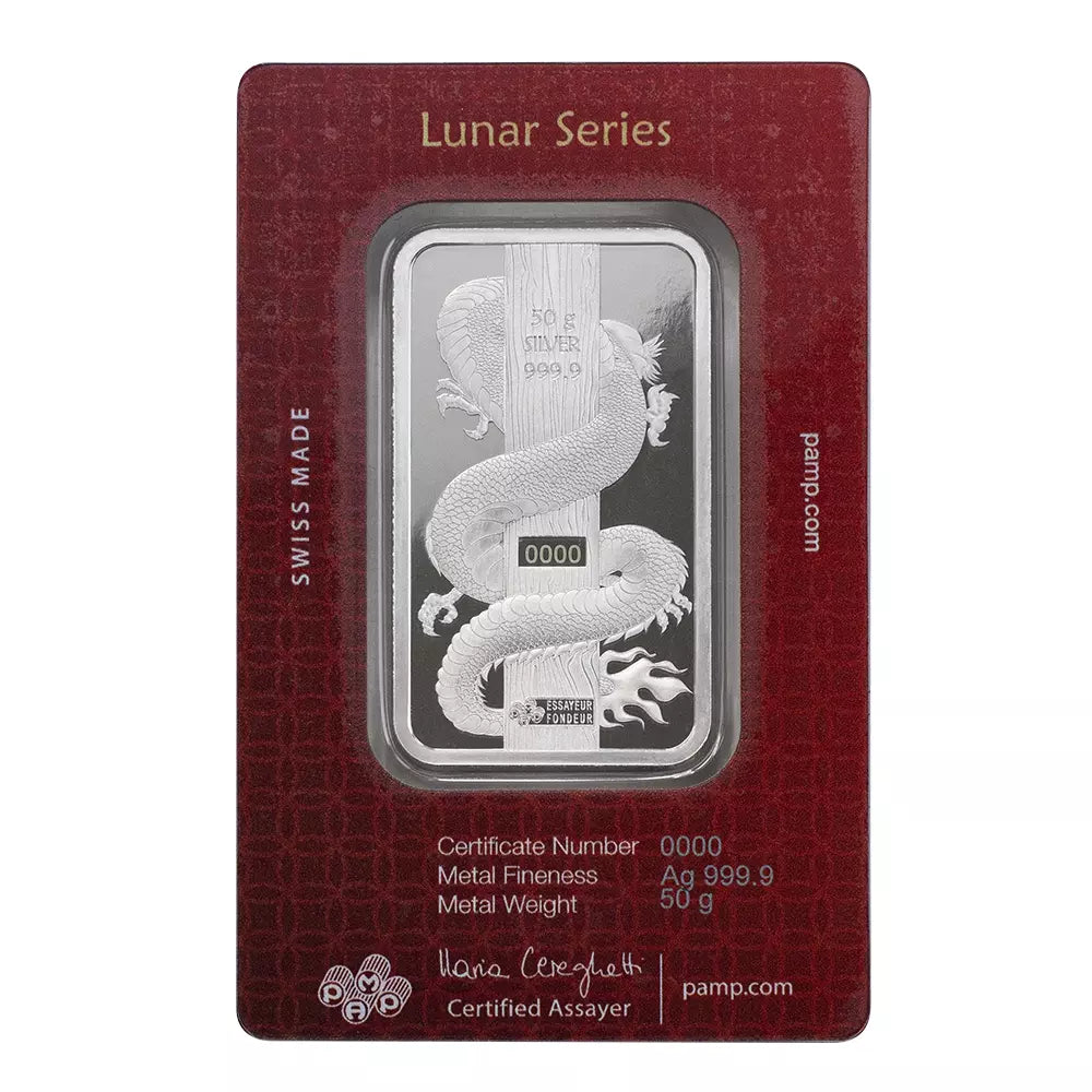 Each silver bar comes sealed in an original assay card, providing both protection and authenticity. The assay card includes essential details such as the weight, purity, and serial number, ensuring the integrity of your investment. The Lunar Dragon Hologram Silver Bar is not only a testament to PAMP’s artistry and Swiss provenance but also a celebration of the mythical and cultural significance of the dragon in Eastern traditions.