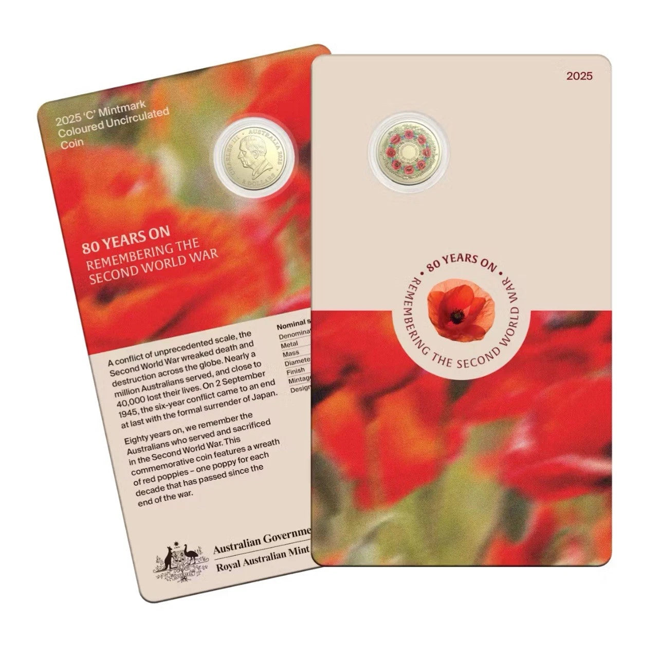 In honour of the courageous Australians who served in the Second World War, the Royal Australian Mint presents these coins. The coins features a wreath of red poppies – an enduring symbol of remembrance in Australia and other Commonwealth nations. Surrounded by sculpted leaves, the eight poppies in the wreath represent the eight decades that have passed since the most devastating war in human history.