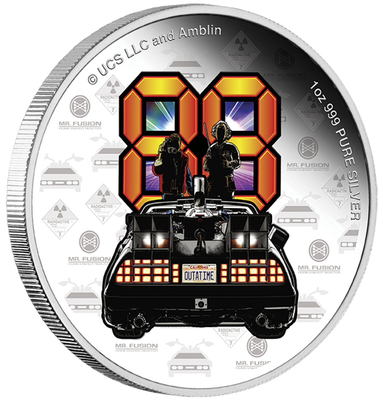 The coin’s reverse features an image of the DeLorean from Back to the Future, stylilised image of Doc and Marty and number 88 - to celebrate the significance of 88mph – the speed the DeLorean must reach to initiate time travel.