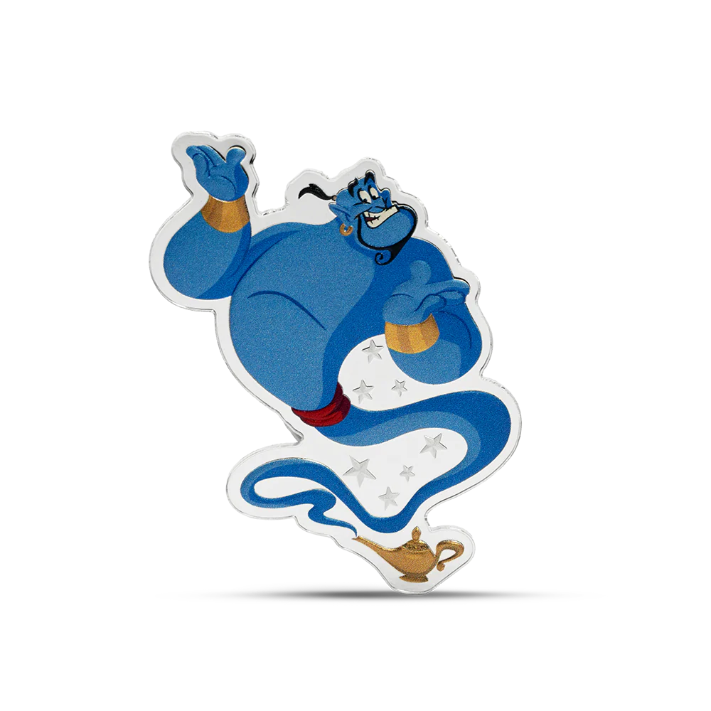 This officially licensed 1oz silver collectible captures the Genie from Disney’s Aladdin in his iconic cartoon style, shaped and colored with striking detail. He’s captured in 1oz of999 pure silver, detailed in bold blue color and featuring his iconic grin. This standalone release is limited to just 1,000 worldwide.