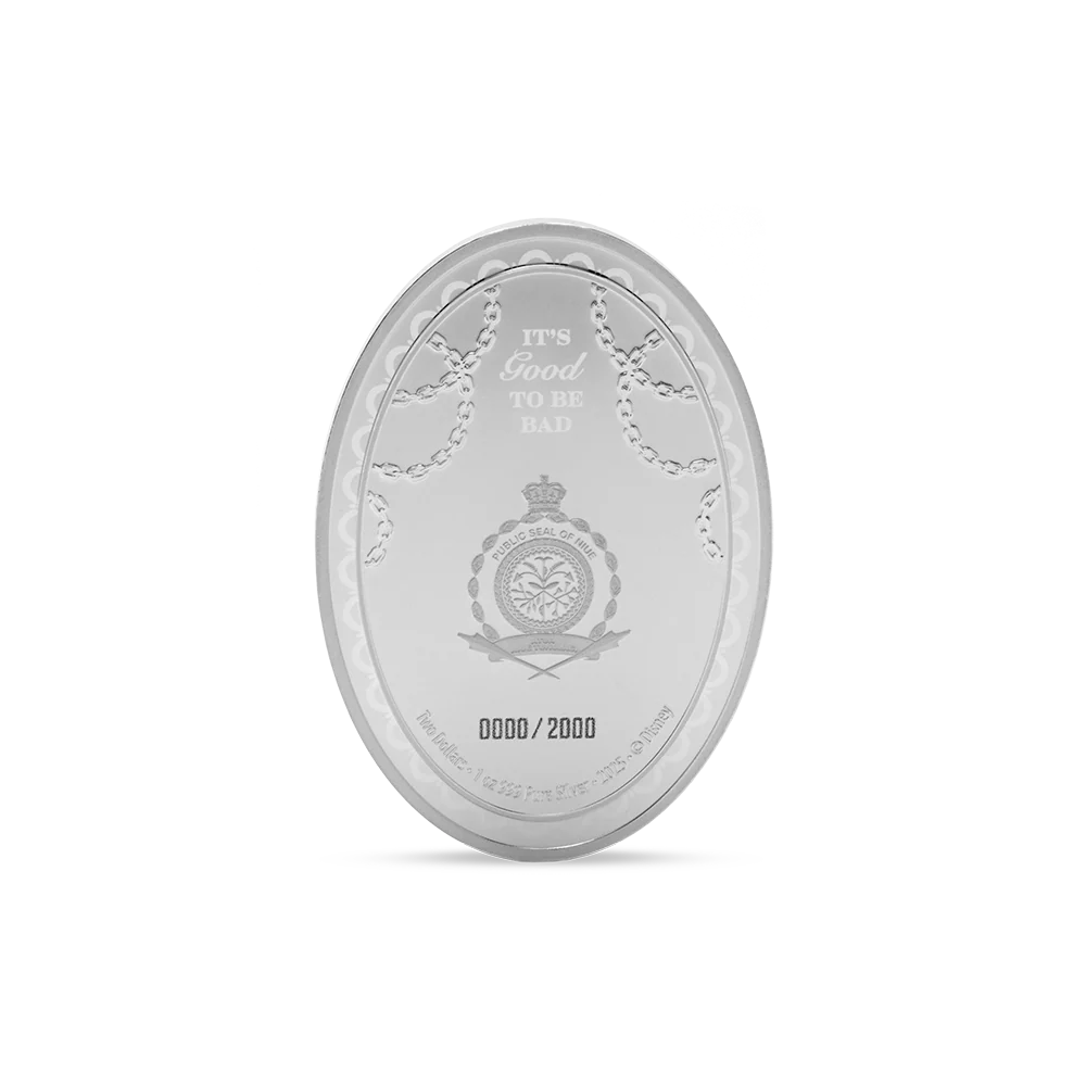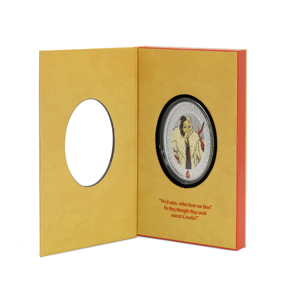 Disney’s most devilish fashionista, Cruella De Vil, is here, captured in 1oz of 999 pure silver. Her sharp features, striking black-and-white hair, and fiery red attire are brought to life in vivid color and proof detail.
