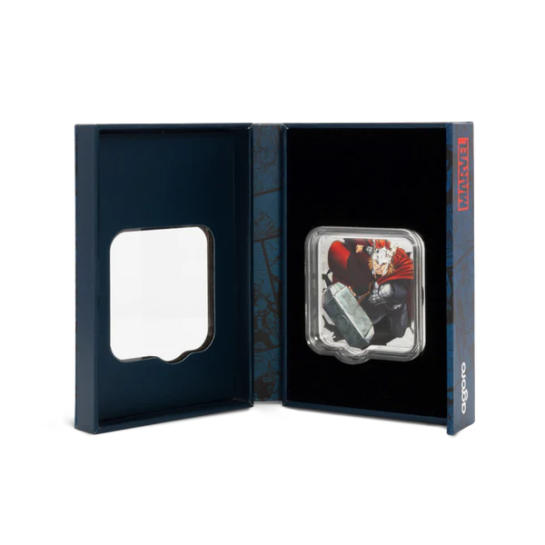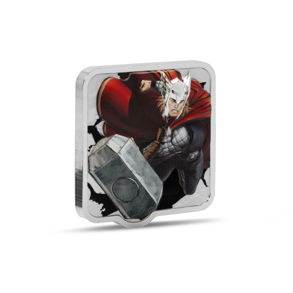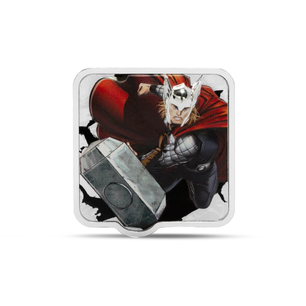 - The reverse shows Thor hurling his hammer through stone, clad in his iconic costume with proof and color detailing.