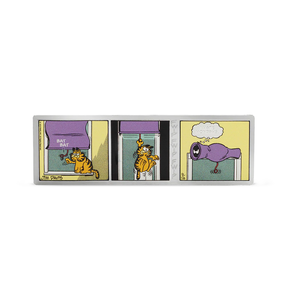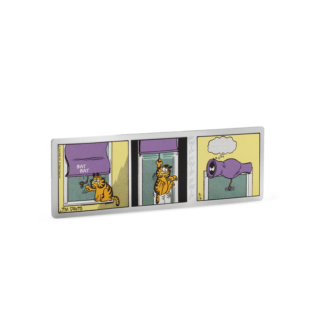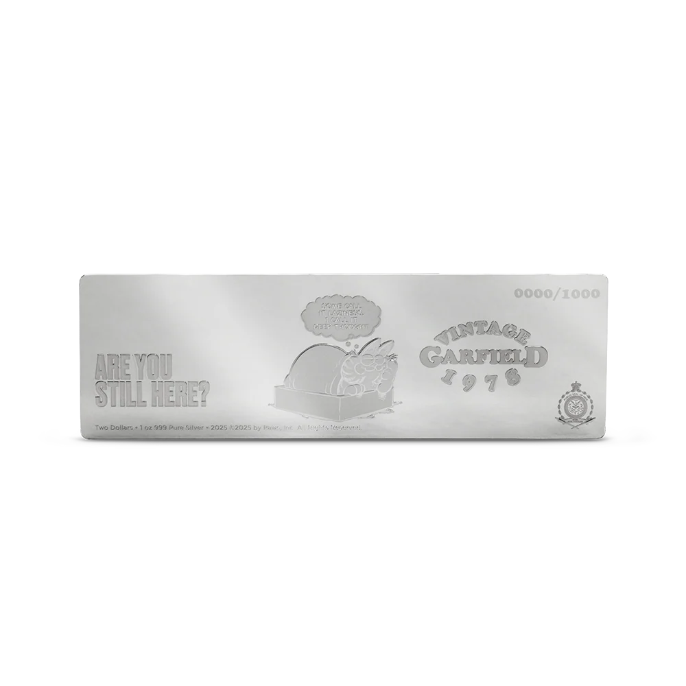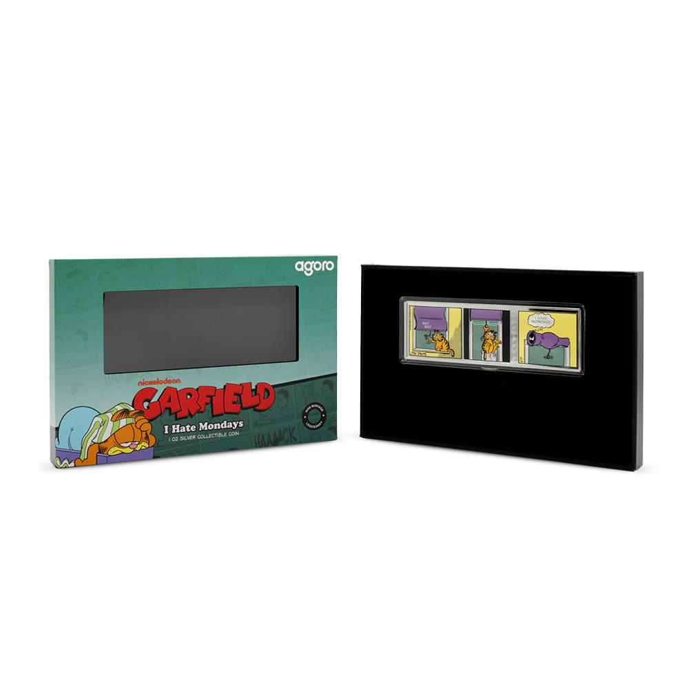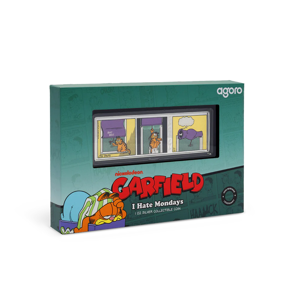 Each 1oz silver piece is struck from 999 fine silver, individually numbered, and presented in Garfield-themed packaging with a Mark of Authenticity.