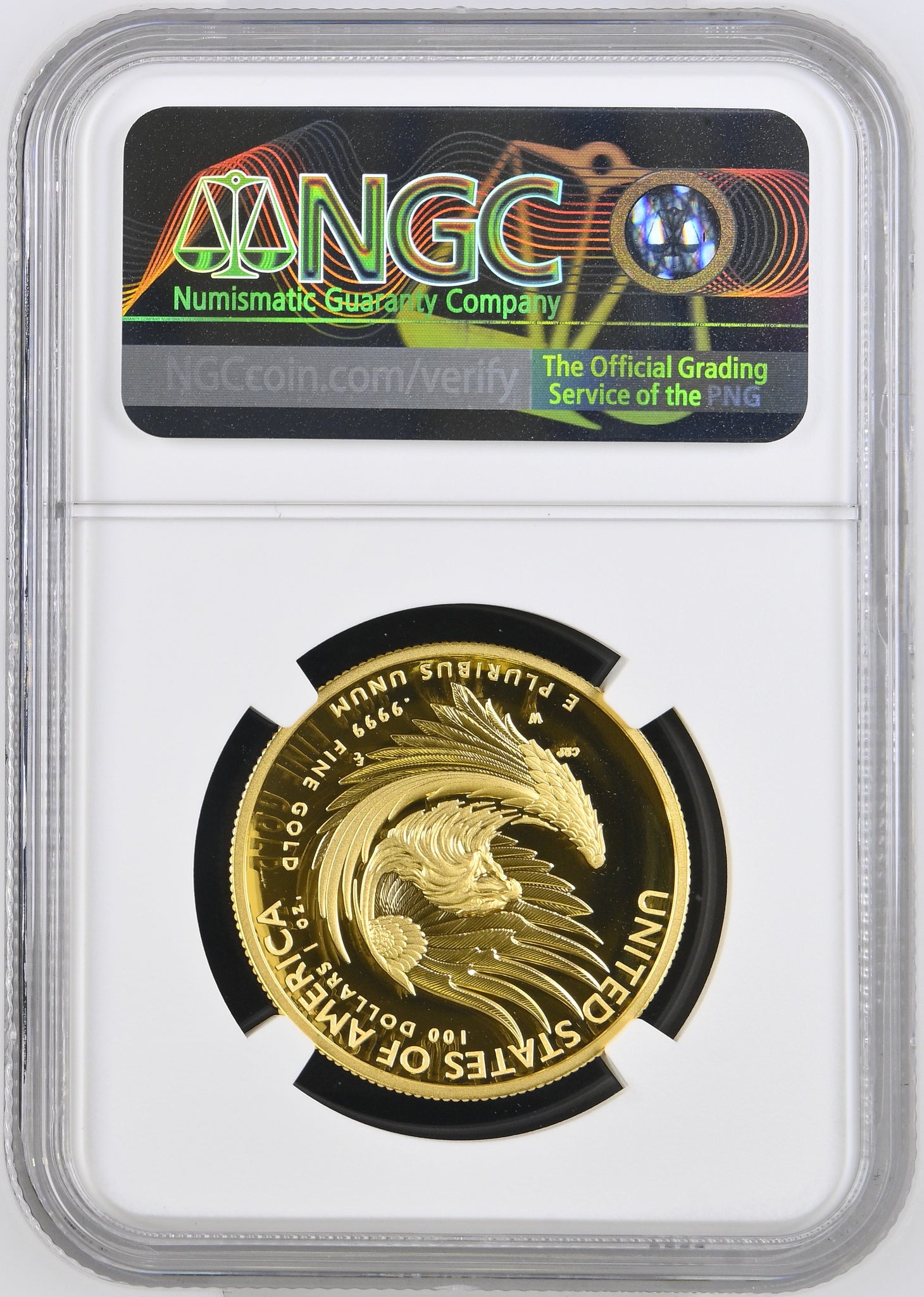 The reverse (tails) design depicts an energetic and swirling depiction of an eagle. Inscriptions are “UNITED STATES OF AMERICA,” “100 DOLLARS,” “1 OZ.,” “.9999 FINE GOLD,” and “E PLURIBUS UNUM.”