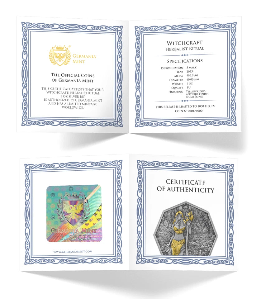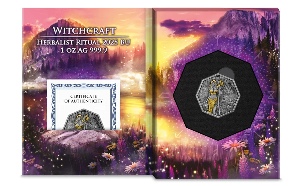 Herbalist is the second character in the exceptional Witchcraft series created by Germania Mint. The 2025 Witchcraft: Herbalist Ritual 1 oz Silver BU coin continues the fascinating story of women from Germanic mythology – endowed with wisdom, magical power, and a deep bond with nature.