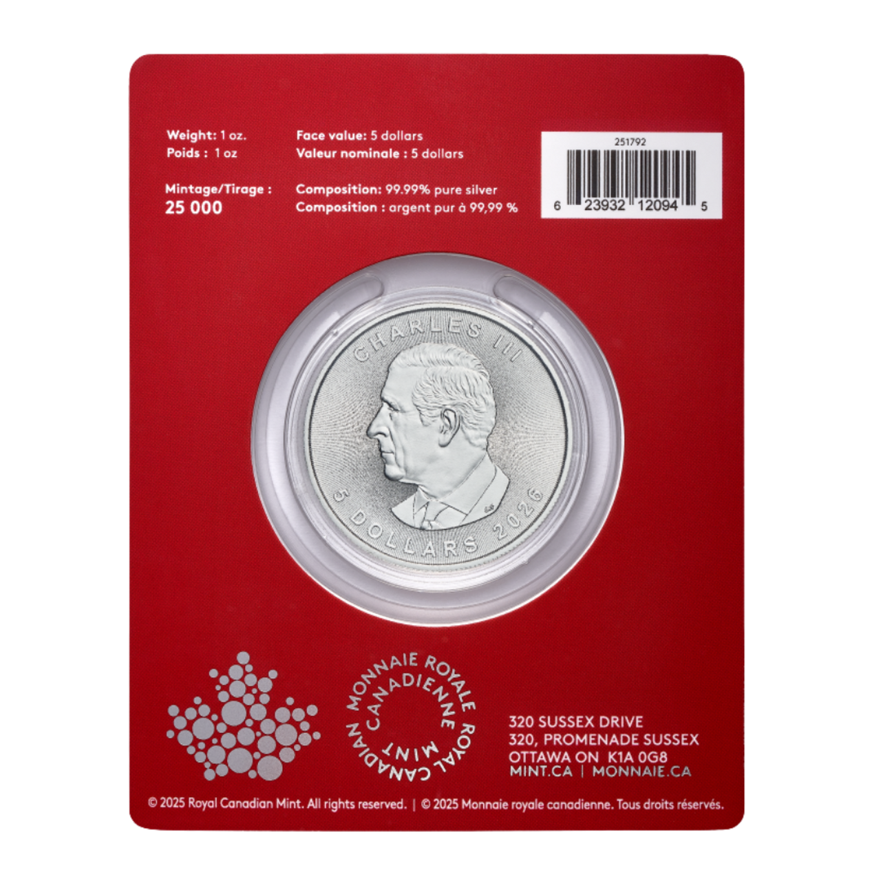 Featuring the effigy of His Majesty King Charles III, the 2026 Treasured Silver Maple Leaf bullion coin makes it easy to give or collect 99.99% pure silver—a lasting treasure that is both precious and pure.