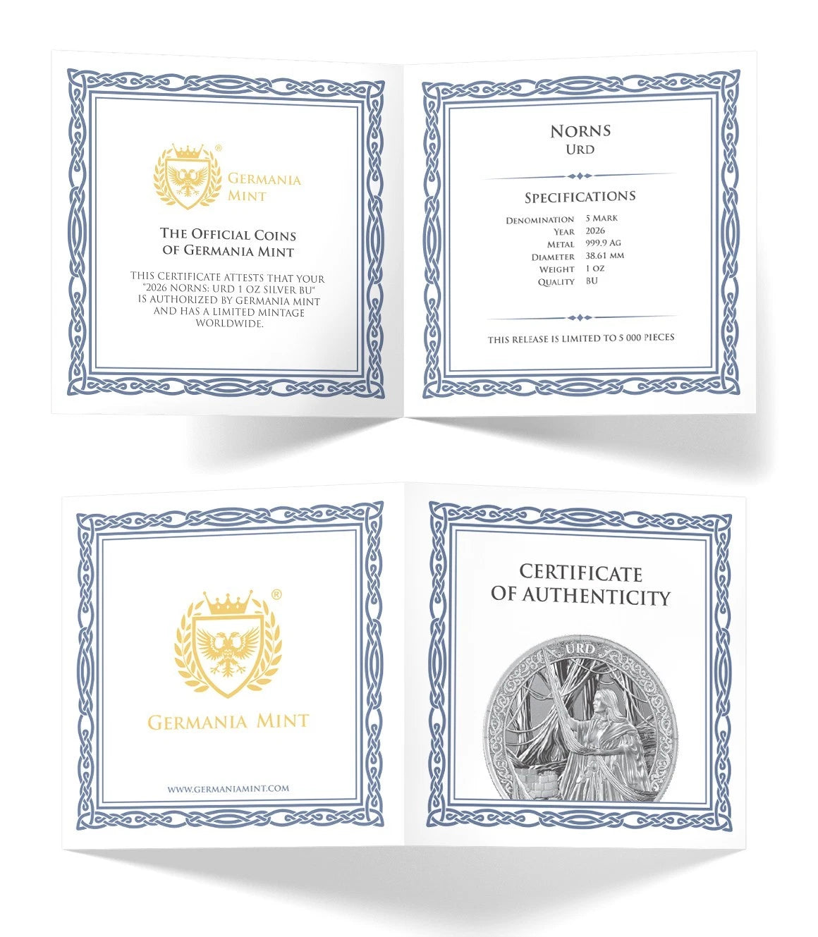In Germania Mint’s interpretation, Urd is depicted as a beautiful and wise being, weaving the golden thread of the past and reaching for memories and experiences. Standing at the foot of the Tree of Life, she carefully observes what has passed. Her eyes appear blind, yet they see far more than others. Dressed in an elegant gown and adorned with jewelry imbued with magical power, she exudes calm and timeless wisdom.