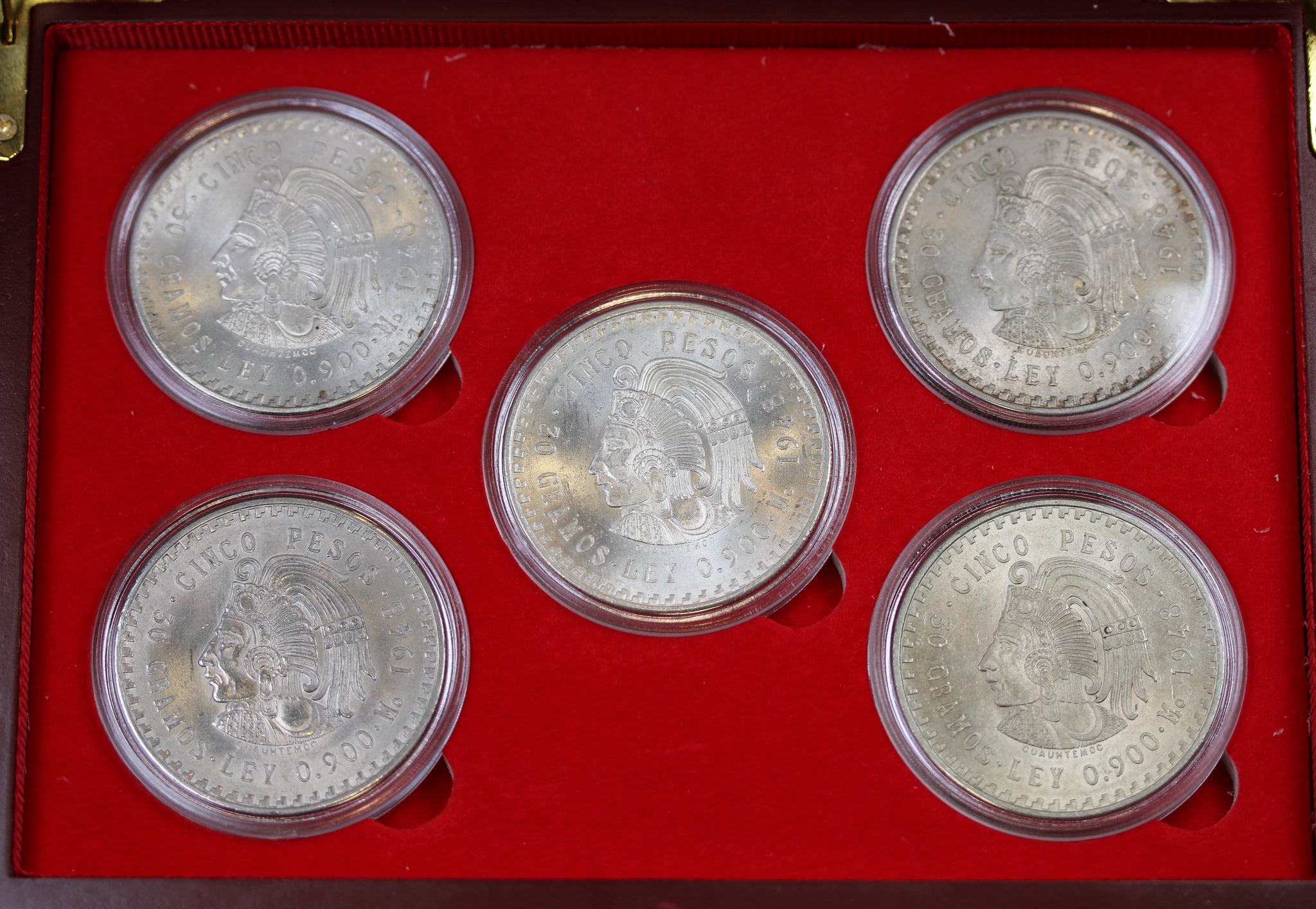 This box contains five identical 1948 Mexican Cinco Pesos silver coins, each in Extremely Fine condition. Struck at the historic Mexico City Mint, the obverse displays the iconic Mexican eagle devouring a rattlesnake atop a prickly pear cactus. The reverse features Cuauhtémoc, last Aztec emperor, surrounded by bold geometric motifs. Composed of 30 grams of .900 silver, these coins combine strong visual impact with important national symbolism and consistent quality throughout the set.