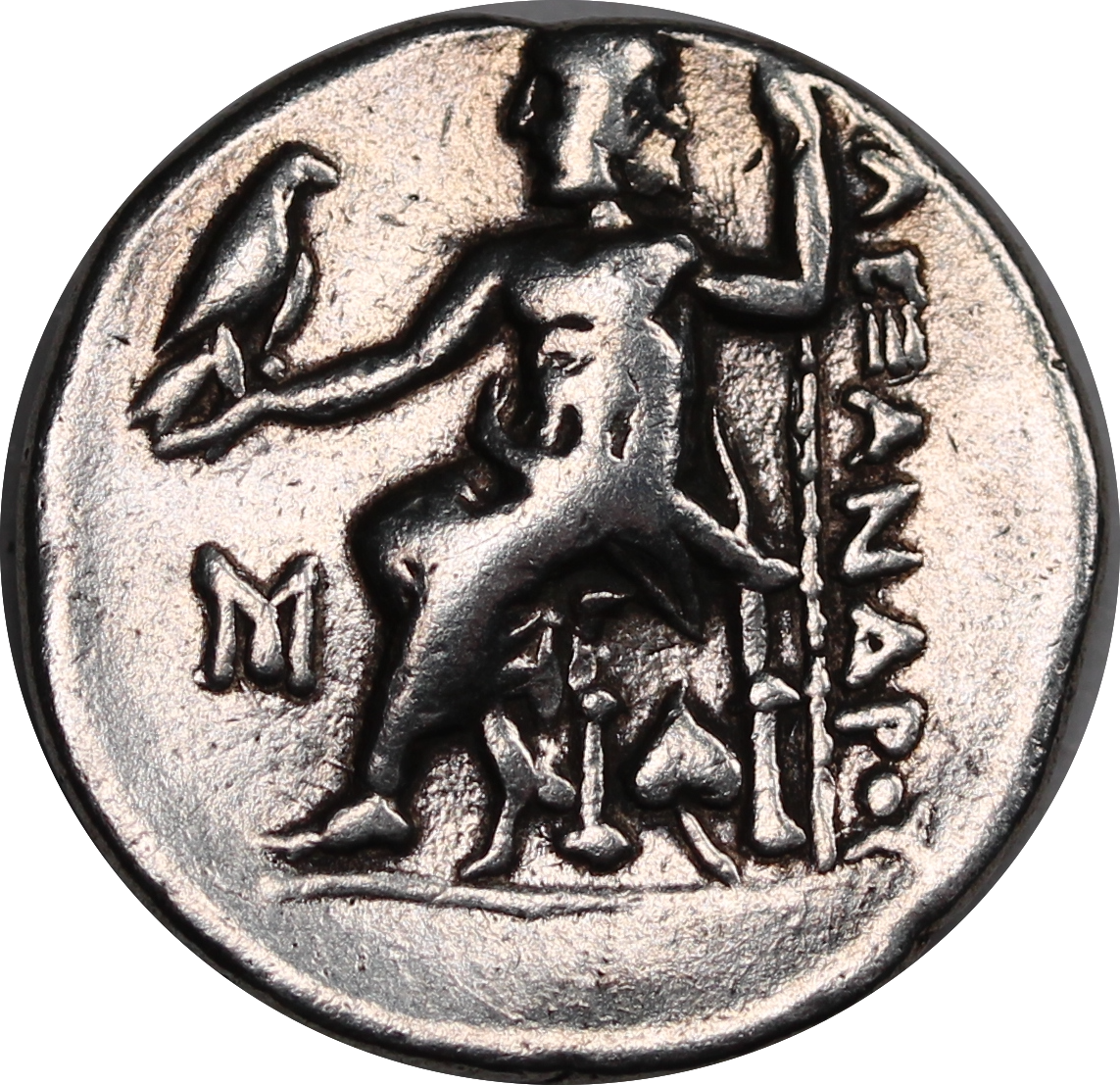 Distinctive control symbols—a MY monogram in the left field and an ivy leaf beneath the throne—identify the minting authority and issue. This drachm embodies both the enduring legacy of Alexander and the continuation of his monetary standard across the Hellenistic world.