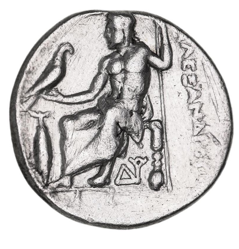 Silver drachm from the Kingdom of Macedon during Alexander III's reign (336-323 B.C.). This coin, weighing 4.22 grams, was minted circa 323-317 B.C. in Abydus. One side displays Herakles' head in a lion skin with intricate dotted borders, while the other showcases Zeus seated on a throne holding an eagle, with a tuny fish to the left and a mysterious monogram beneath the throne.