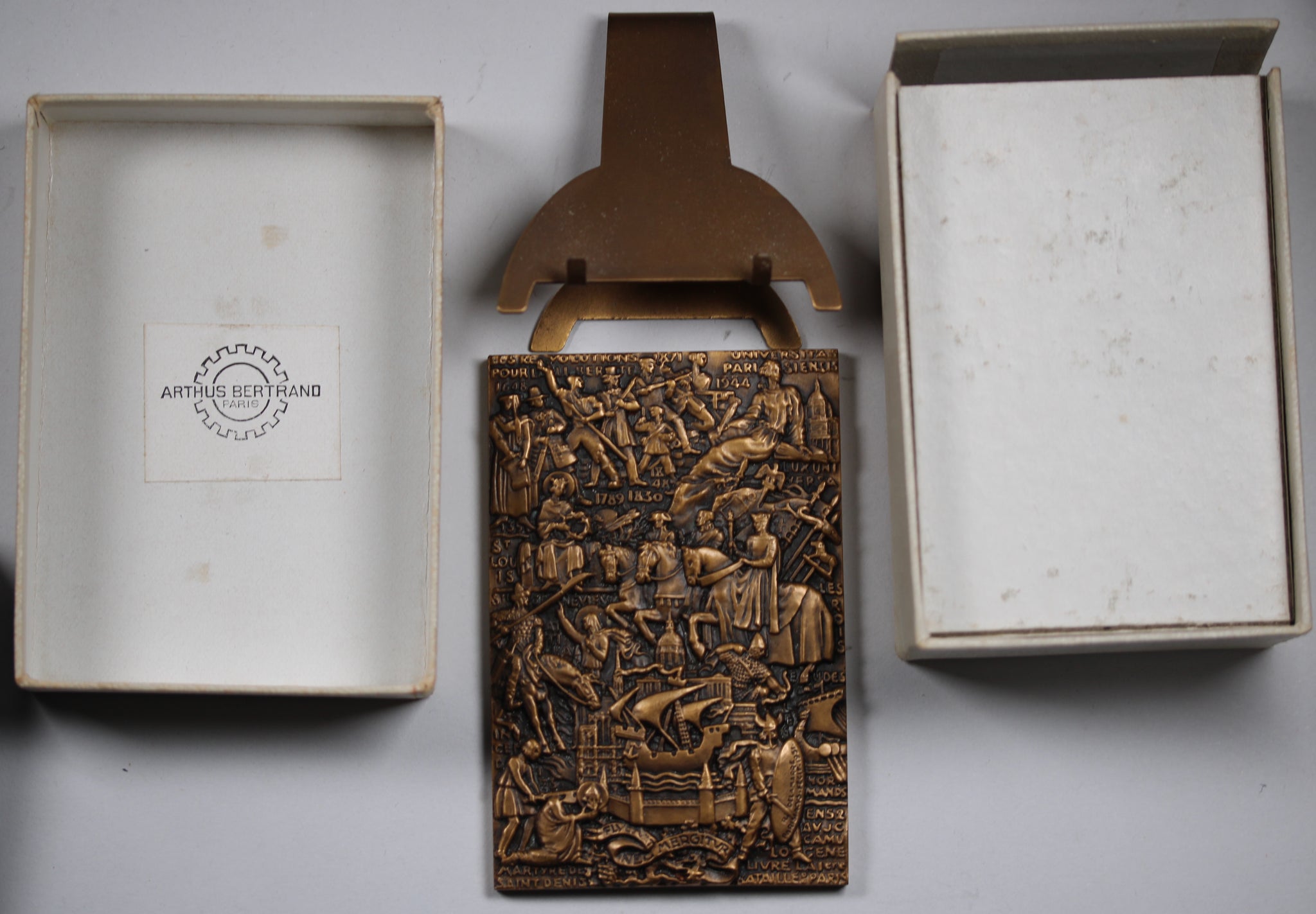 This bronze plaque, crafted by Arthus Bertrand and designed by Raymond Delamarre, commemorates the spirit of Paris with the enduring motto Fluctuat Nec Mergitur (“Tossed but not sunk”). Presented in its original fitted box with display stand, the piece reflects themes of resilience and liberty, echoing the ideals of the French Revolution. Delamarre’s artistry captures classical strength and symbolic depth, while Arthus Bertrand’s fine production highlights French medallic tradition. Elegant and historically resonant, the plaque stands as both a decorative object and a tribute to Paris’s identity as a city that withstands adversity while upholding freedom and endurance.