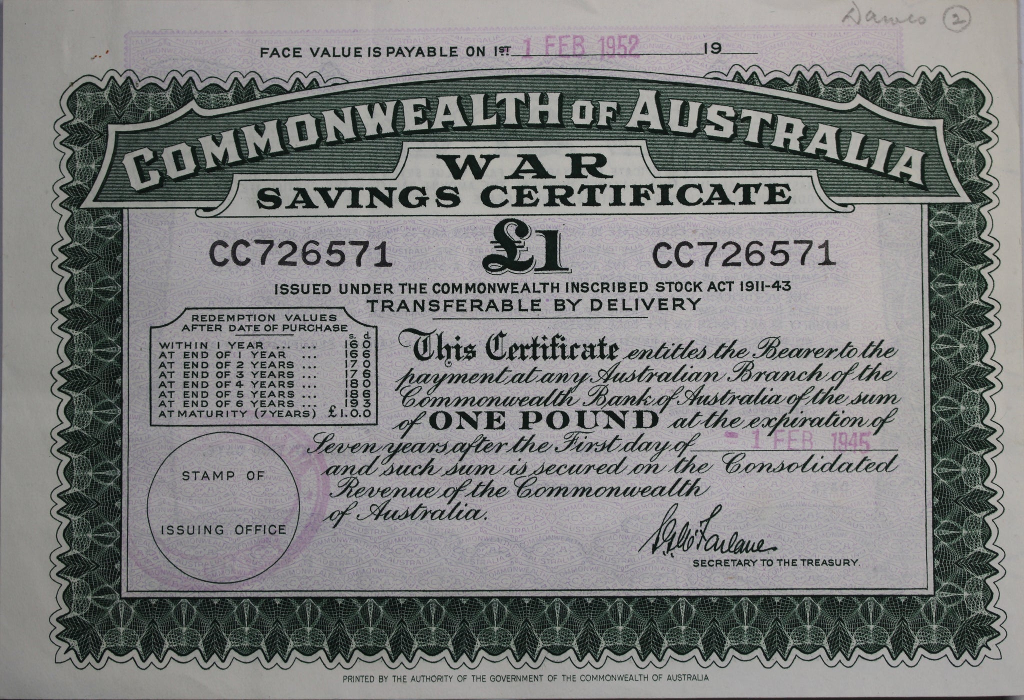 Between 1940 and 1945, Australians purchased War Savings Certificates to help fund WWII, effectively lending the government money. Available in denominations from £1 to £50, they sold below face value and matured in seven years. Despite wartime hardship, over 3.8 million applications raised £1.16 billion. The government promoted the scheme with posters, parades, and public displays. With taxes rising and rationing in place, this mass financial effort was key to covering the war’s £2 billion cost.