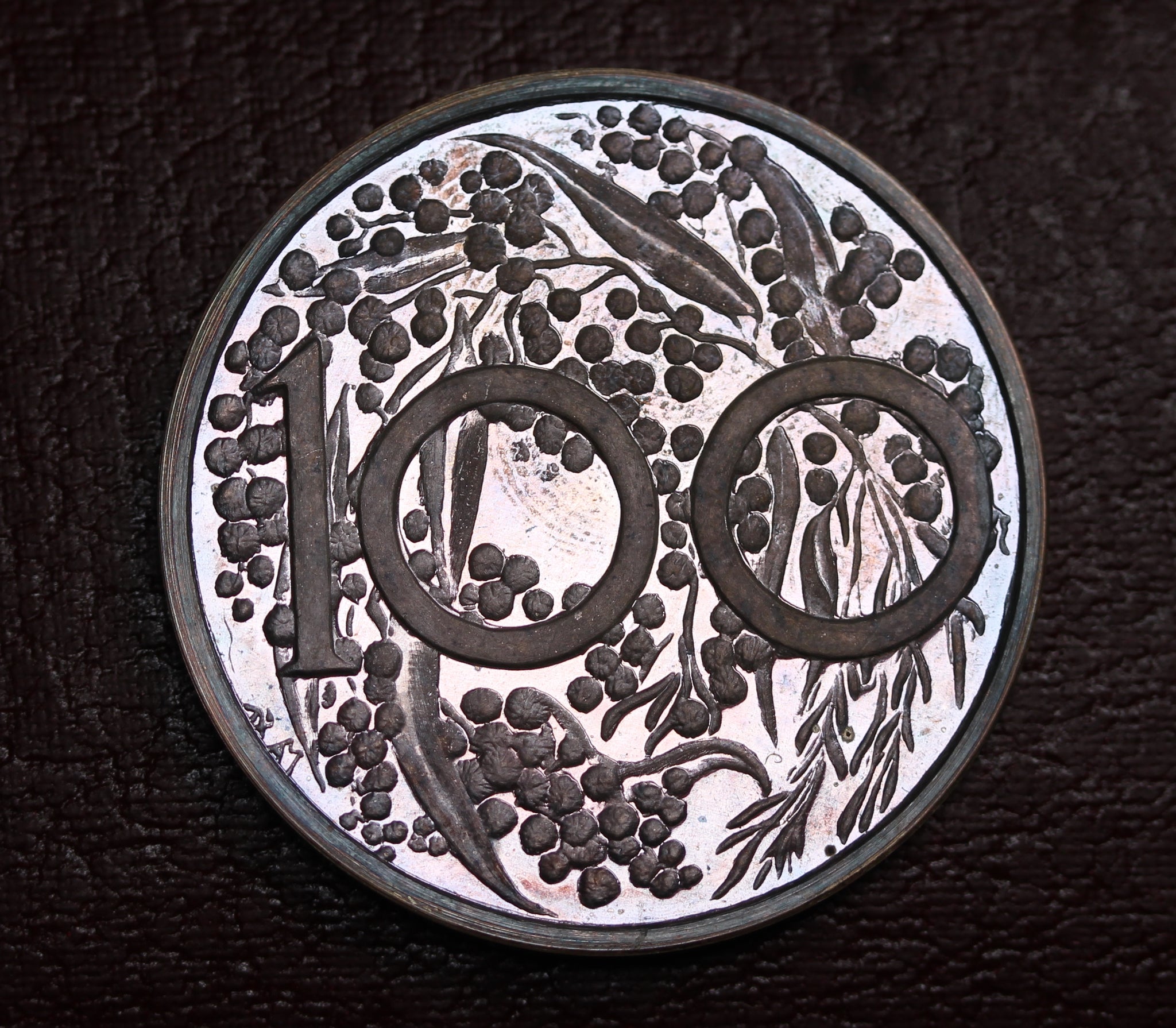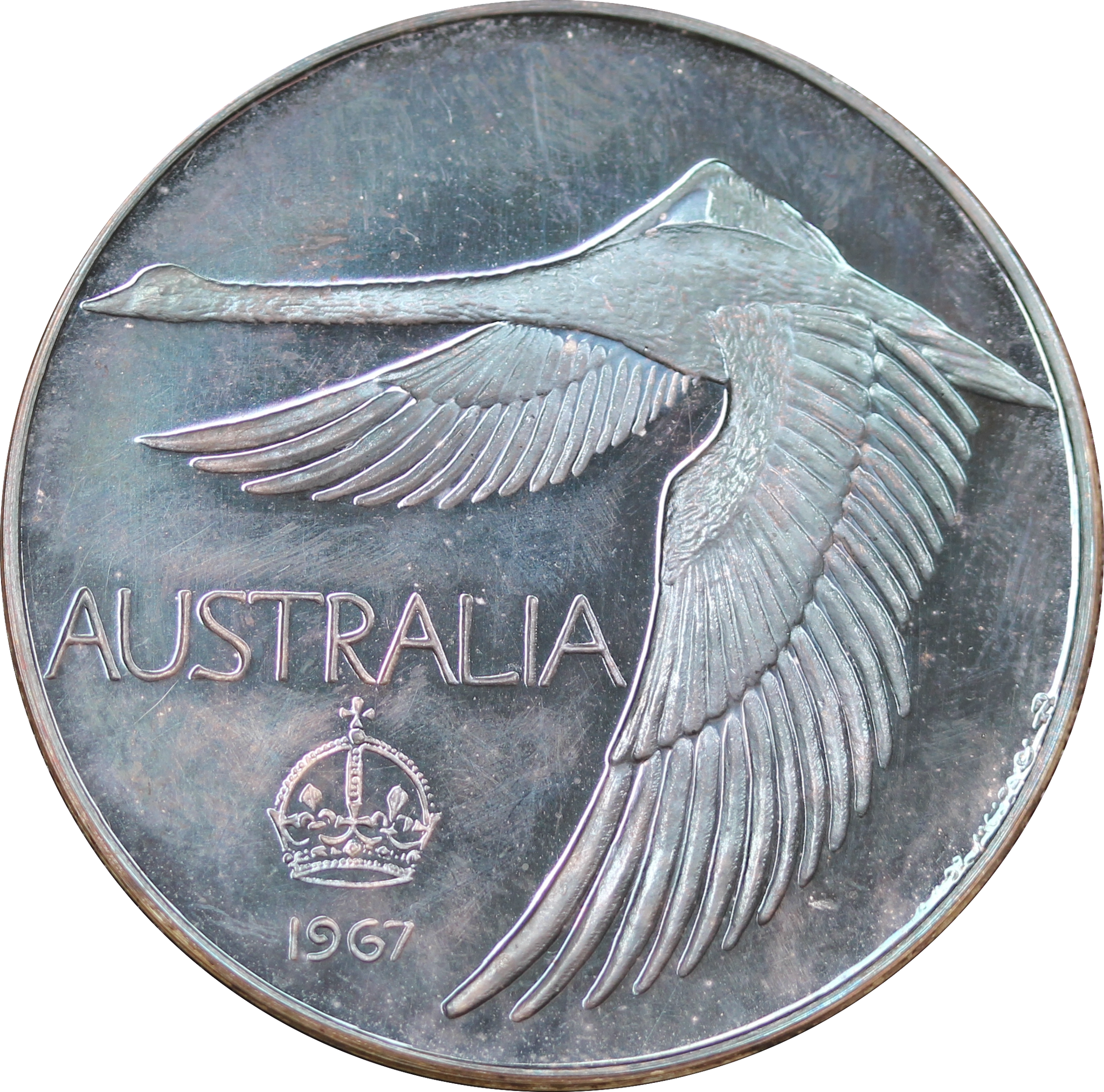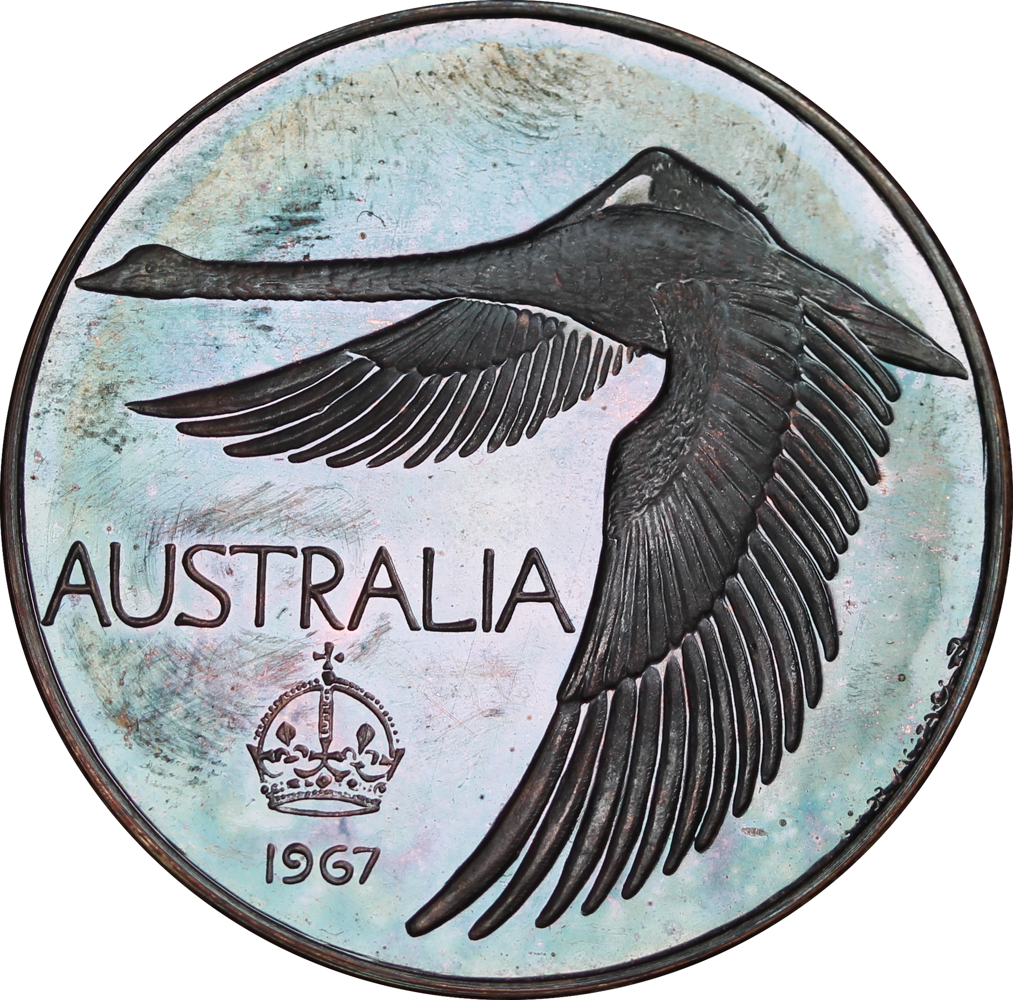 The 1967 unofficial Australian Pattern ‘Crown’ Proof Dollar, commonly known as the Goose Dollar, was commissioned by the Australian Coin Review and struck by Pinches of London. It was designed by renowned medallist Andor Mészáros (1900–1972), who had previously competed to design Australia’s new decimal coins but lost to Stuart Devlin. The obverse features a flying swan adapted from Mészáros’ 20-cent proposal, while the reverse incorporates the wattle motif from his two-cent design.