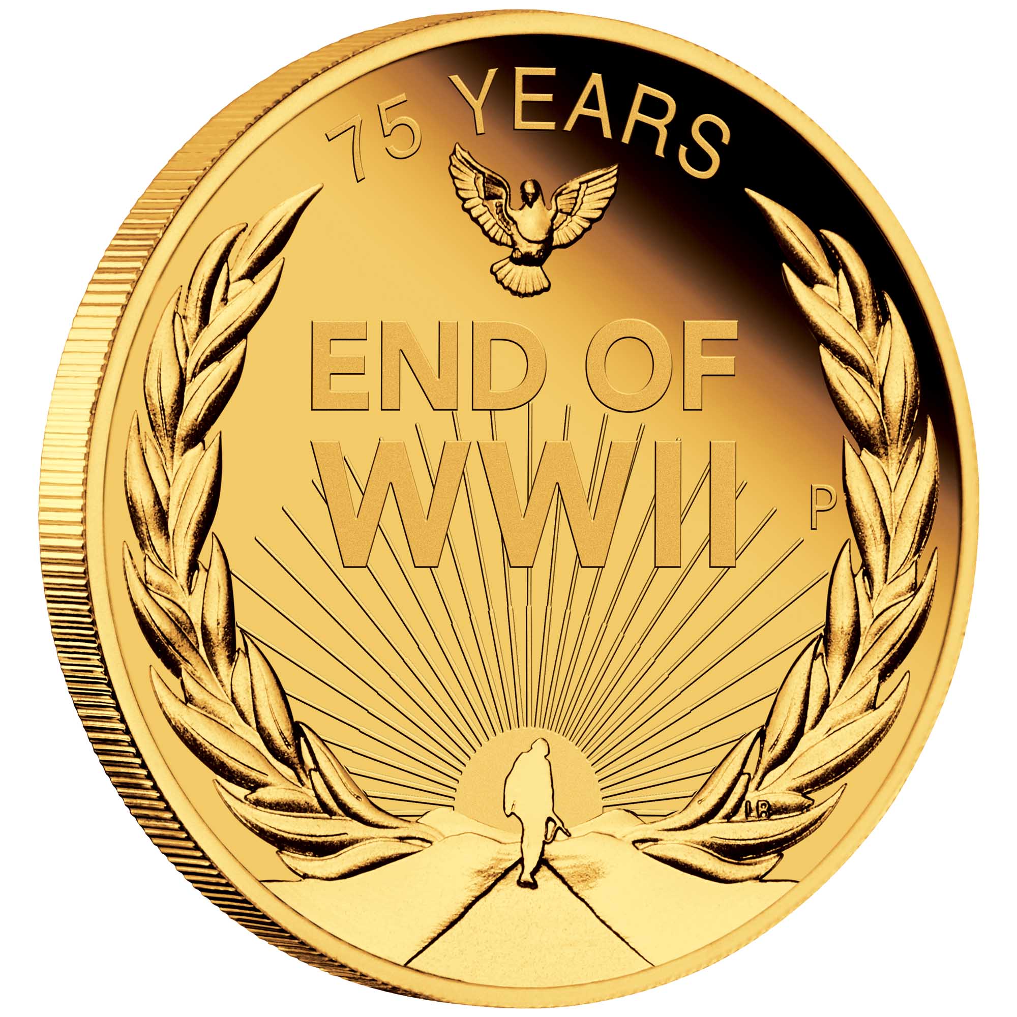The reverse of the coin depicts a stylised representation of a silhouetted soldier walking into the sunset and two wreaths encasing a central dove motif. The inscription ‘75 YEARS END OF WWII’ and The Perth Mint’s ‘P’ mintmark also appear in the design.