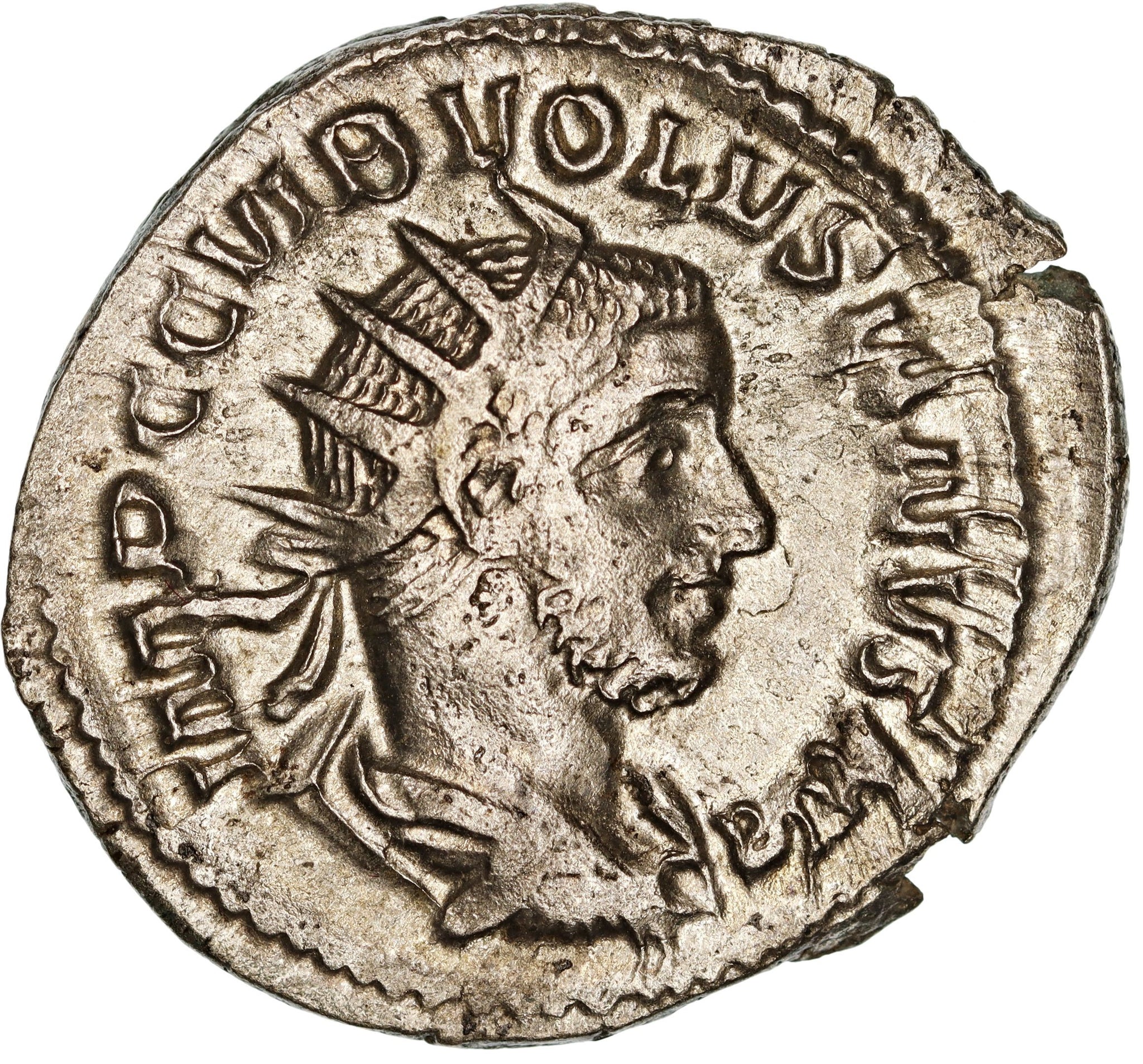 Obverse: Radiate-crowned and draped bust of Volusian facing to the right, legend surrounds, “IMP C C VIB VOLVSIANVS AVG”.