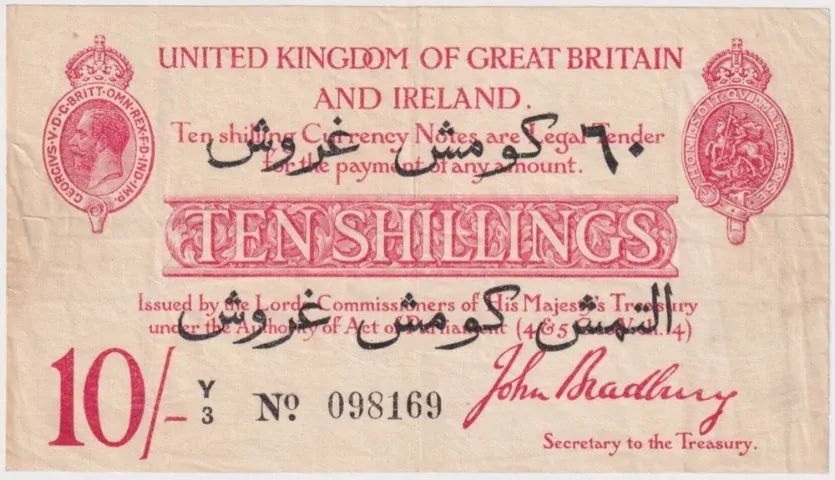 The base notes—known as “Bradbury” issues—were part of only the second series of banknotes ever issued by the British Treasury. Printed in October 1914 on specially prepared watermarked paper, they were later adapted for use in the campaign. The ten-shilling version carried two lines of Ottoman Turkish, translating to “Piastres silver 60” and “Piastres silver sixty.”