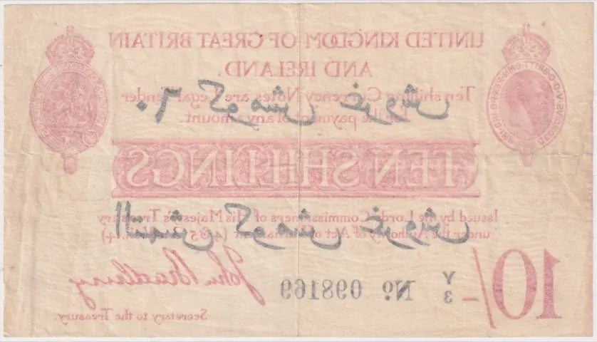 Known as Dardanelles Overprints, these were ordinary British Treasury ten-shilling and one-pound notes modified with Ottoman Turkish text. Their purpose was simple but vital: with no Allied military canteens on the Dardanelles peninsula, troops needed a way to buy supplies from local merchants. These overprinted notes became their link to the local economy.
