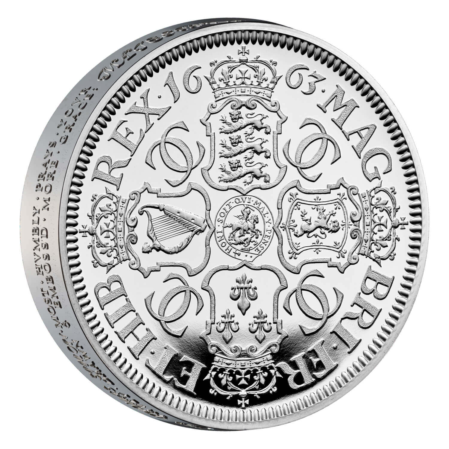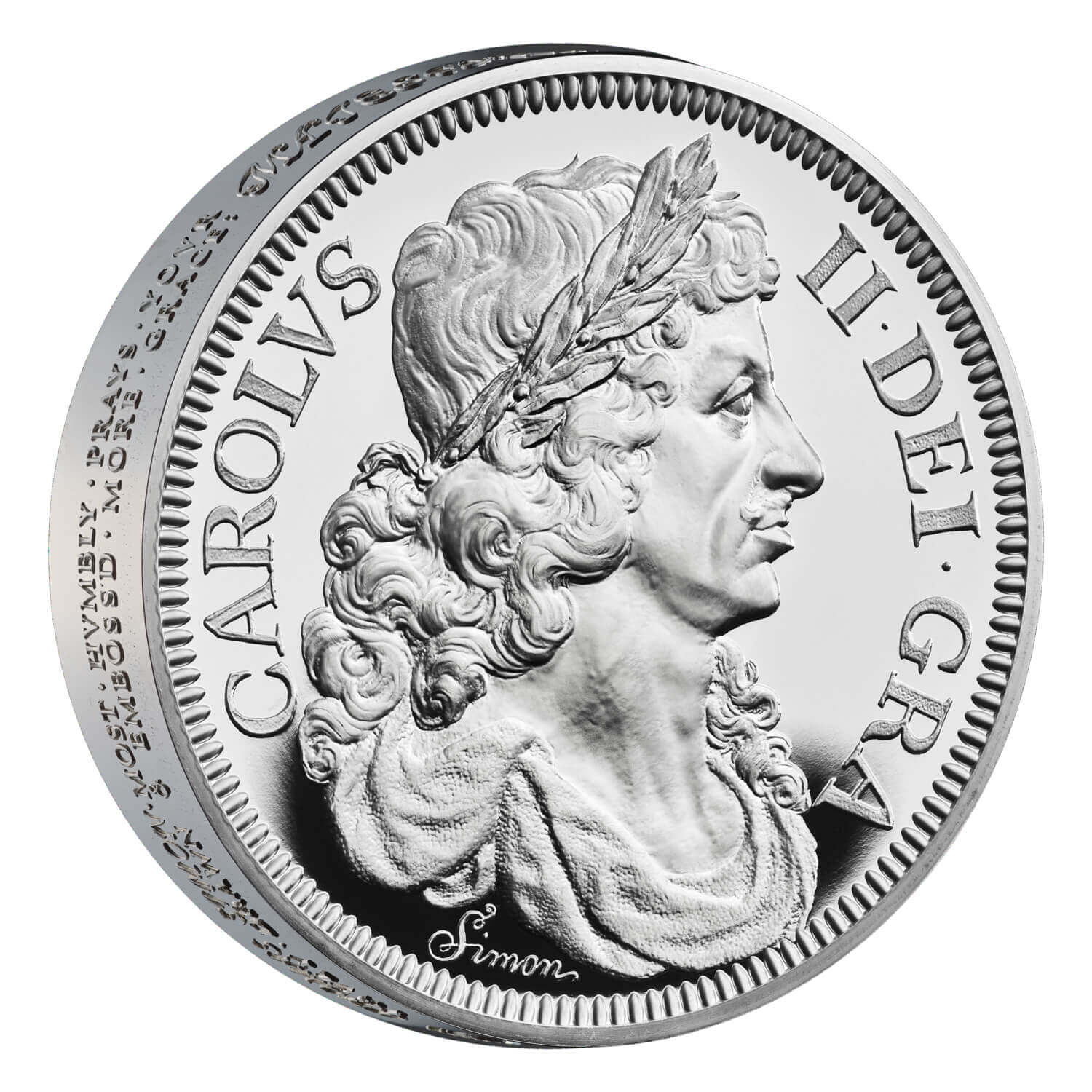 John and his brother Joseph were instructed to engrave a trial crown for Charles II, which seemingly prompted Simon to belatedly respond with a piece of his own. Simon was able to engrave two lines of raised edge lettering that he used to petition Charles II for his selection. We cannot be certain how Simon, during the seventeenth century, was able to produce the two lines as even with the benefit of modern minting technology, recreating the raised edge lettering is extremely challenging and the Royal Mint has only been able to approximate the original inscription through relearning long-forgotten techniques.