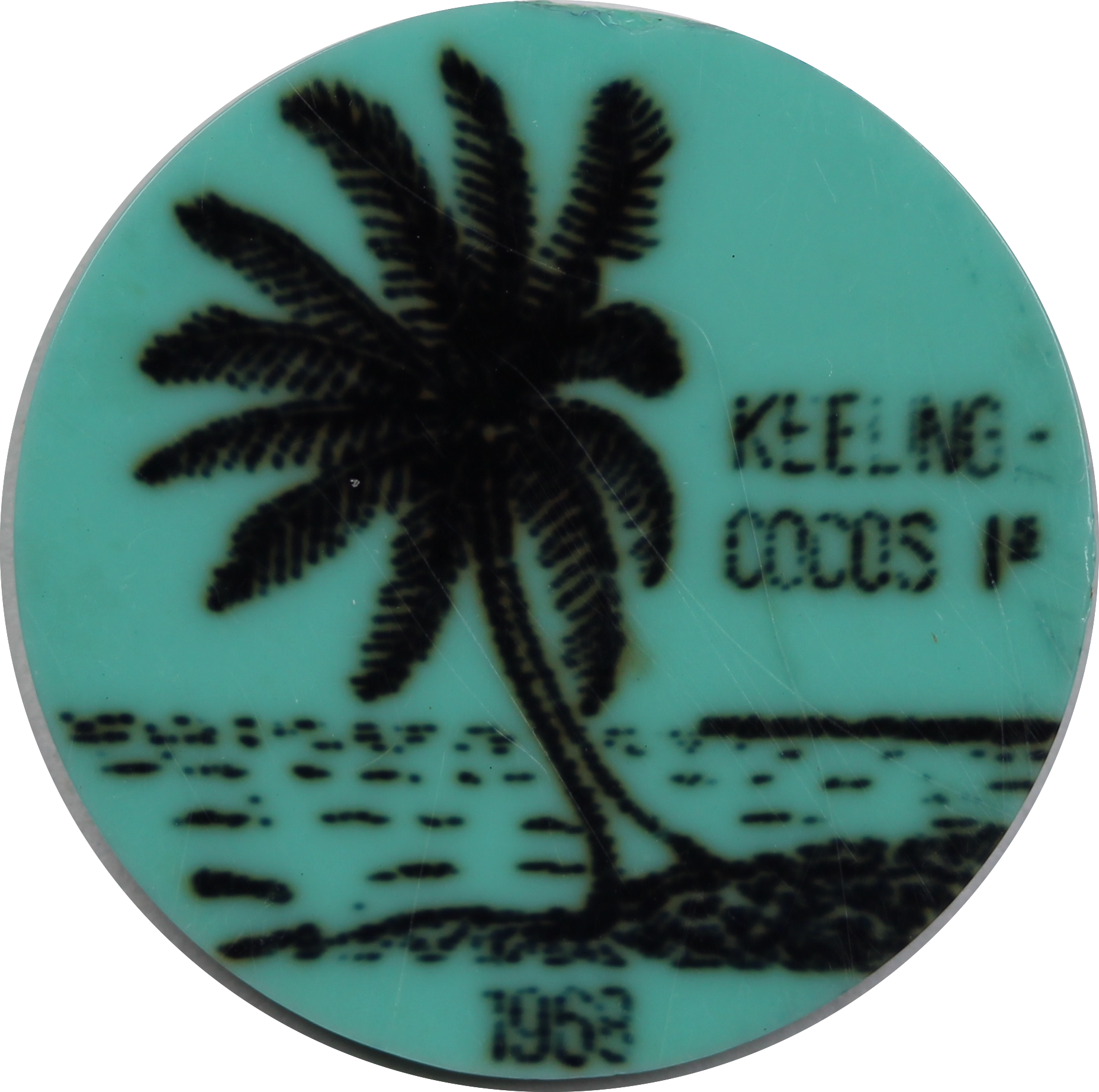 This 1 Cent token, issued in 1968 for the Cocos (Keeling) Islands, forms part of a scarce series of plastic emergency or merchant tokens. Produced in bright, durable plastic, the set ranged from 5 to 100 Rupees, each showing a palm tree on a small island—symbolising the Cocos’ long-standing coconut industry. Their exact function remains uncertain, though evidence suggests local use in trade or as substitutes for small change.