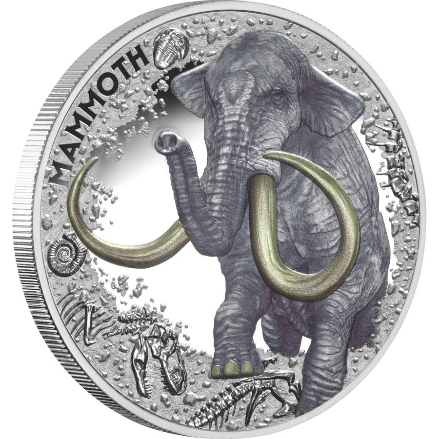 Struck to the pinnacle of Proof quality from pure 99.9% silver, and enhanced with colour, the coin honours the Columbian Mammoth (Mammuthus colombi ). An enormous herbivore, the Columbian Mammoth was one of the largest species of mammoths. Much bigger than its Woolly Mammoth counterpart, the Columbian Mammoth had a shoulder height of around 4 metres and could weigh as much 12 tons! In addition, they had tusks more than two metres in length!