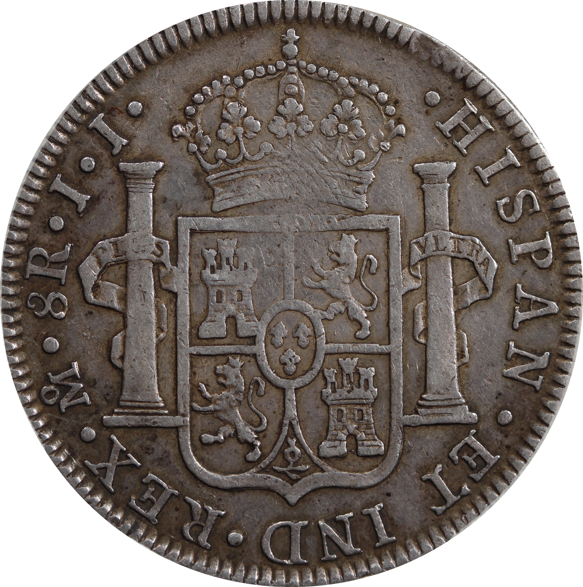 The reverse displays the crowned Spanish arms between the Pillars of Hercules, inscribed “HISPAN ET IND REX Mo 8R HJ,” signifying “King of Spain and the Indies.” The motto “PLVS VLTRA” translates to “Further Beyond.”