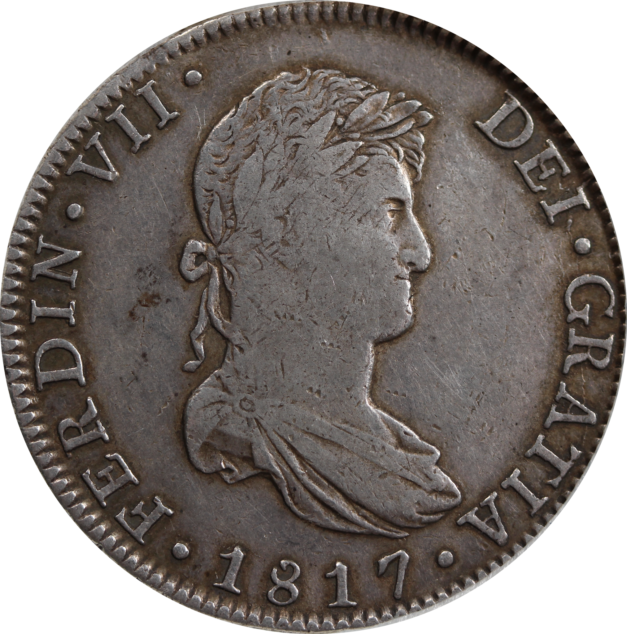 This silver 8 Reales coin, struck in 1817 at the Mexico City Mint, features the laureate bust of King Ferdinand VII of Spain with the legend “FERDIN VII DEI GRATIA,” meaning “Ferdinand VII by the Grace of God.”