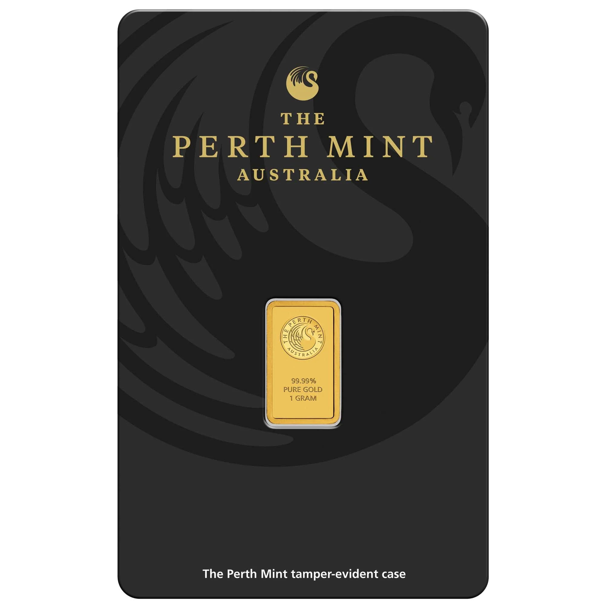 Each minted bar comes housed in tamper-evident packaging which shows the word VOID around the edge of the blister if the card has been prized opened. The card is charcoal-coloured with a dark, watermark-like image of the Mint’s stylised swan logo.