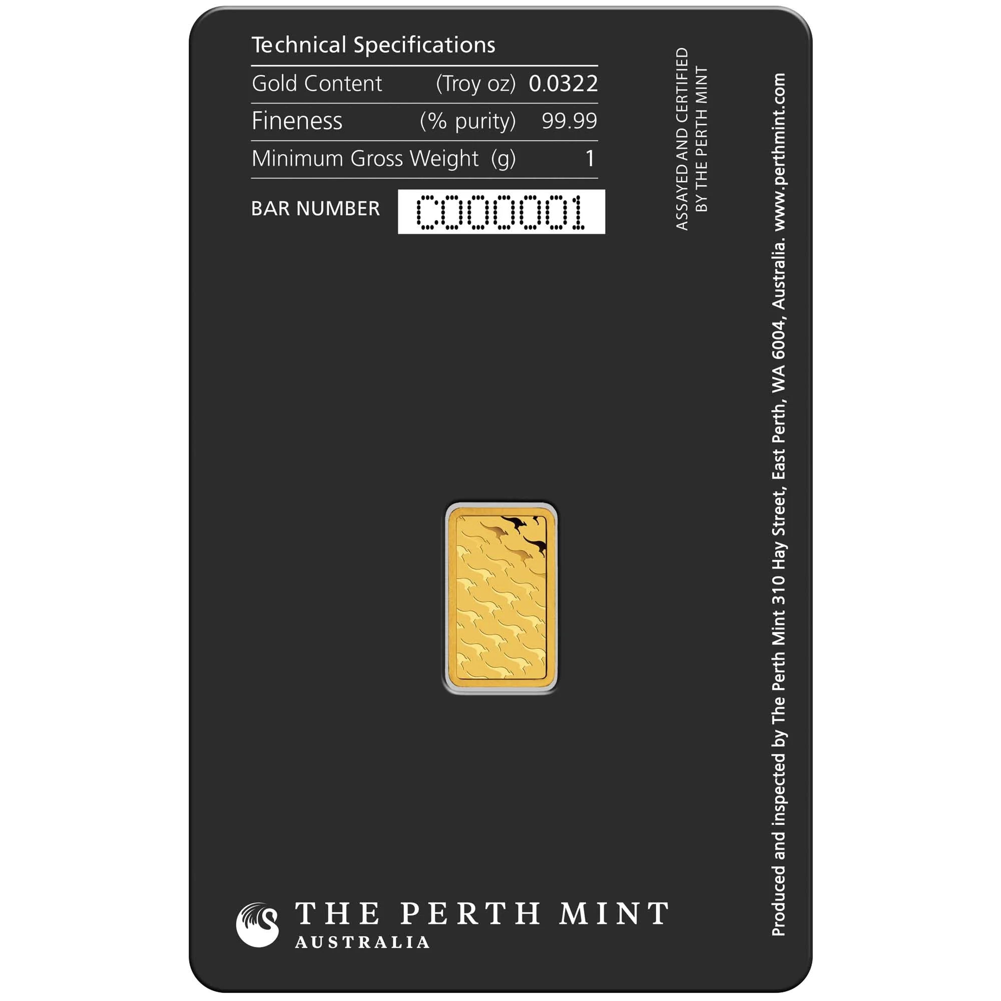 The 1g gold bullion minted bar is one of eight sizes, all with The Perth Mint’s internationally recognised ‘swan’ logo on the front and stylised kangaroo motifs on the back.