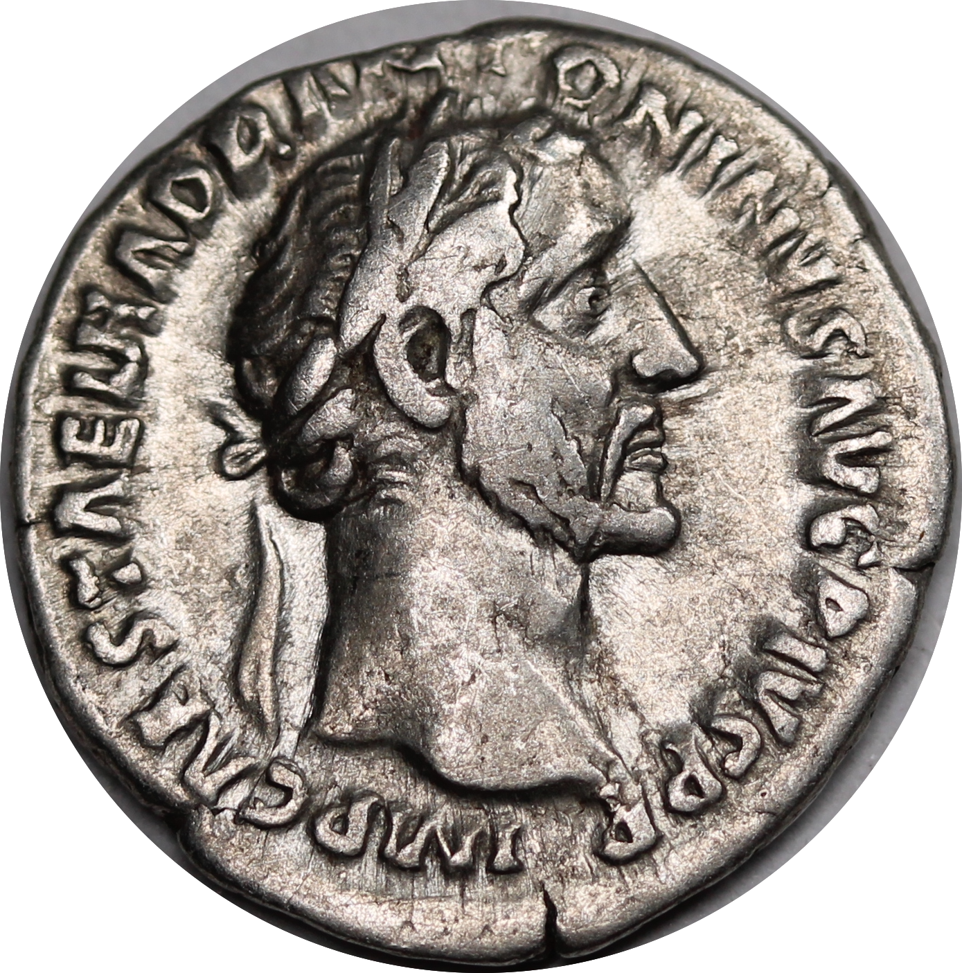 Obverse: Inscription IMP CAES T AEL HADR ANTONINVS AVG PIVS PP surrounding a laureate head of Antoninus Pius facing right.