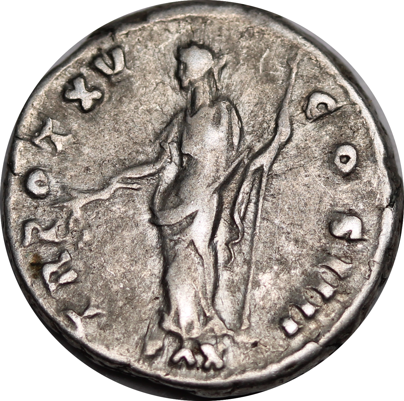 Reverse: Legend TR POT XV COS IIII, with PAX in the exergue. Depicts Pax, draped, standing left, holding an olive branch downward in her right hand and a vertical sceptre in her left.